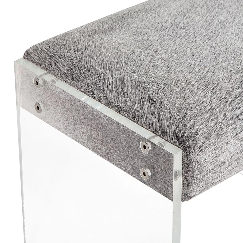 A light natural hide seat tops a clear acrylic base and makes the Aiden Bench a totally chic addition.