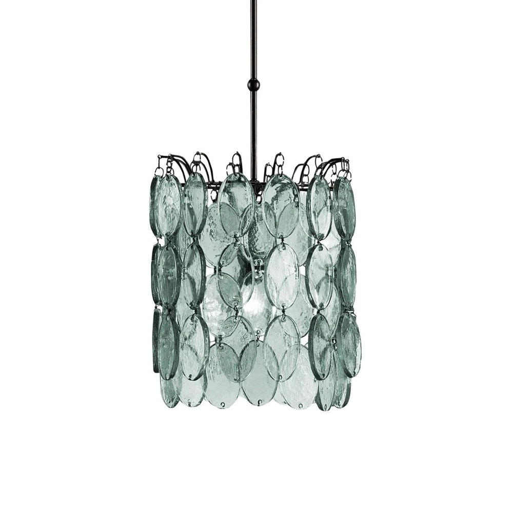 Description: Recycled glass discs arranged in a cascade form the shade of the Airlie Pendant, the intersecting lozenges diffusing the light through a mottled mosaic. Wrought iron is crafted by skilled artisans to create the frame of this glass pendant, which is hand-finished in satin black. Adjustable from 26″ to 56″ with use of included chain/rod kit/cable. If your space calls for a longer drop, additional chain/rods/cable is available for purchase.