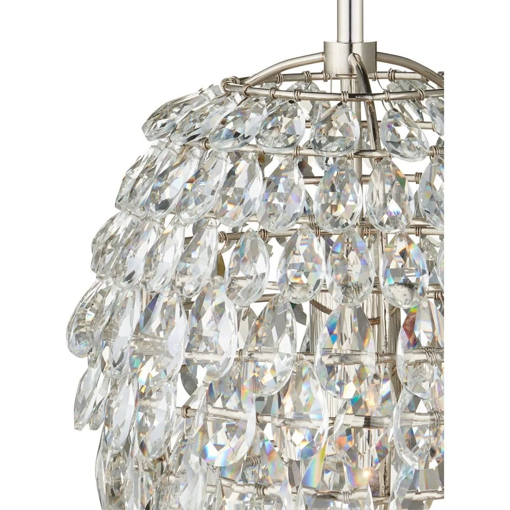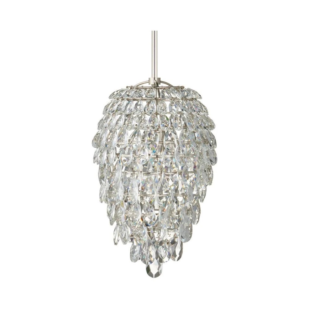 Description: The shade of the Aisling Pendent is made up of hundreds of teardrop optic crystals. This gleaming fixture designed by Iian Thornton was inspired by antique brooches. The metal hardware on the crystal pendant, in a polished nickel finish, is so luminous, it complements the glow perfectly. Adjustable from 23″ to 59″ with use of included chain/rod kit/cable. If your space calls for a longer drop, additional chain/rods/cable is available for purchase.