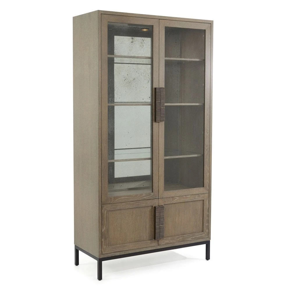 Description: This casual display cabinet is in oak in our Driftwood finish. The tempered glass doors feature beautiful bronze sculptural hardware. The interior features a mirrored back and touch-sensitive lights operated by an inset summary on the right-hand side of the cabinet.