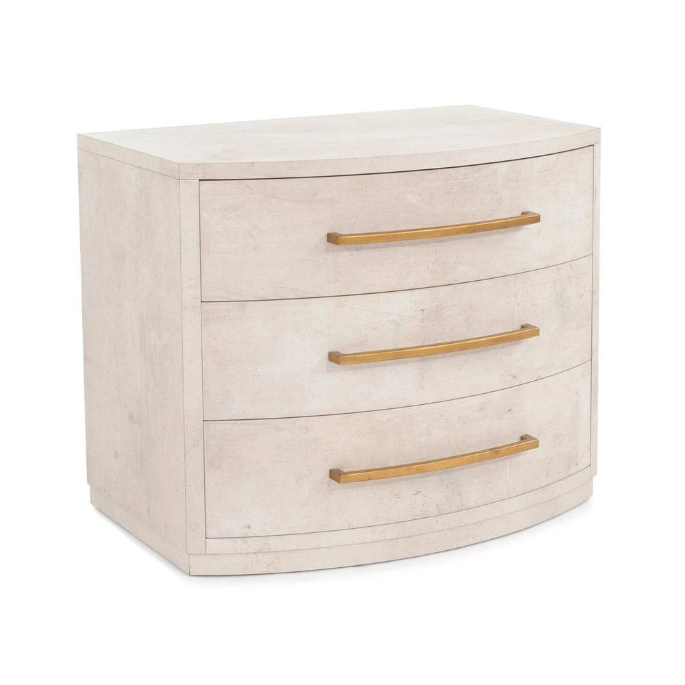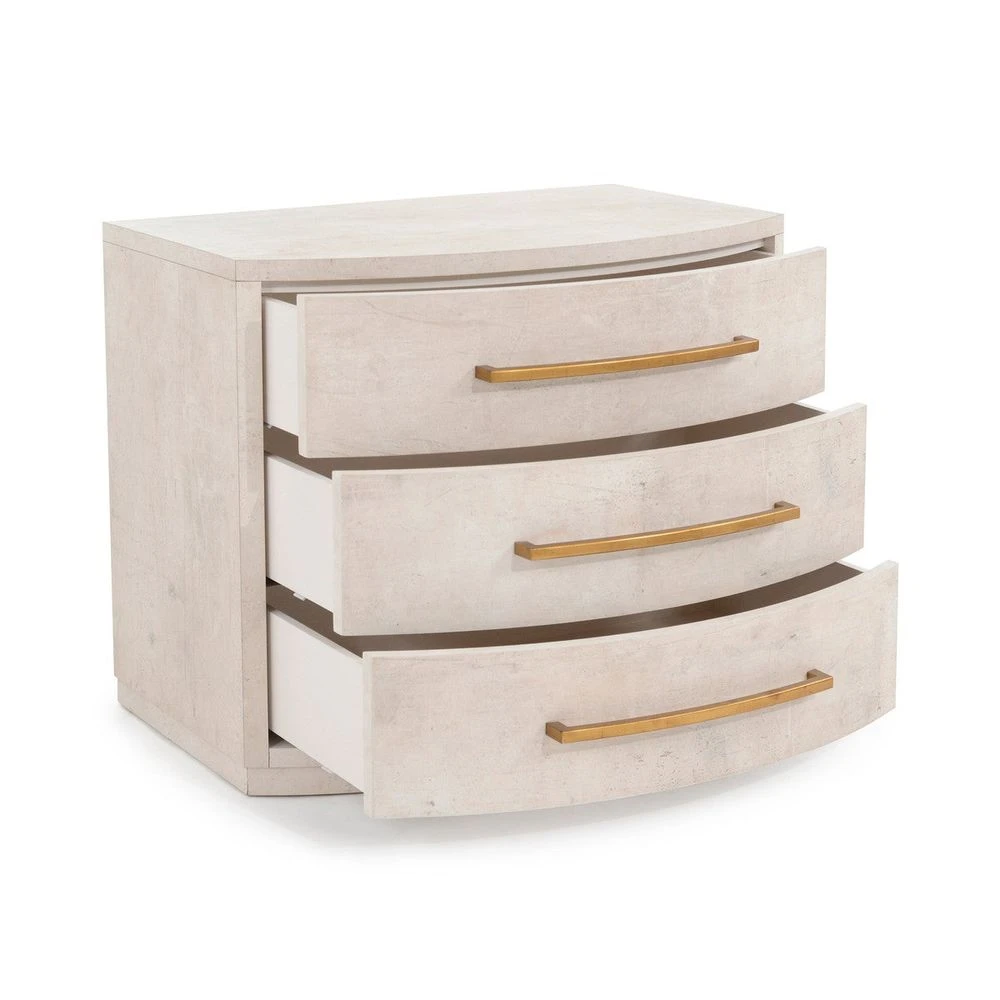 Description: This three-drawer nightstand with an elegant, curved front is finished in tiza gesso. It features soft-closing drawers with elongated, curved handles in antique gold.