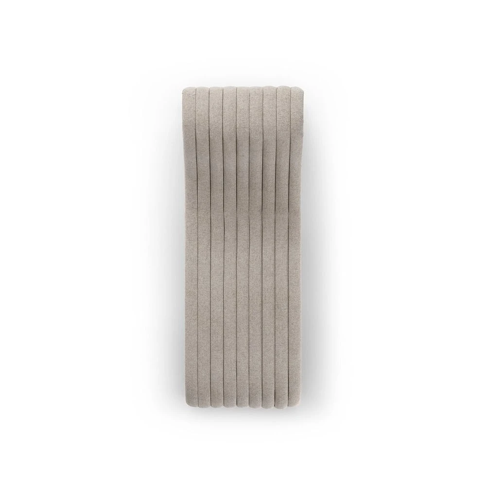 A modern take on classic chaise, textural polyester seating with a subtle herringbone pattern adopts dramatic linear channeling for texture and comfort alike.