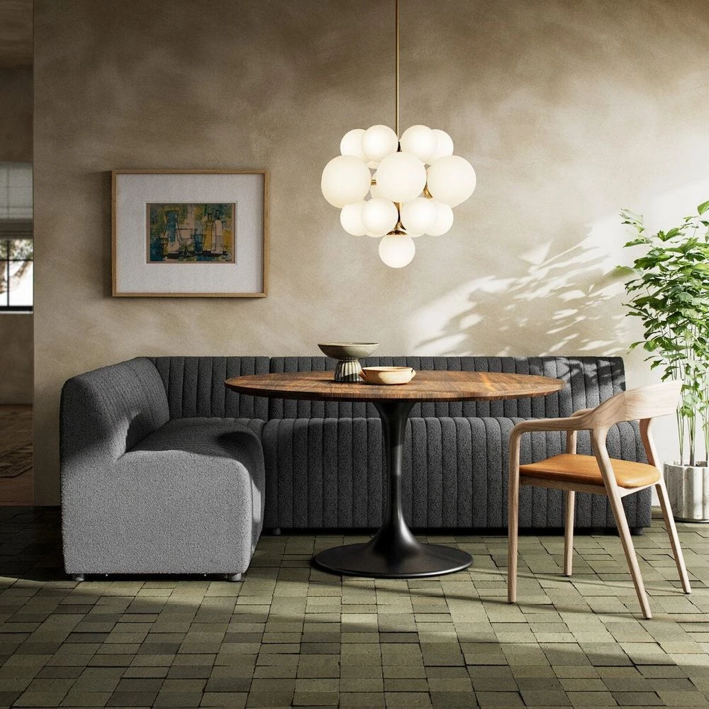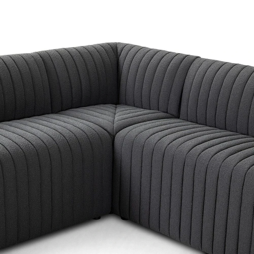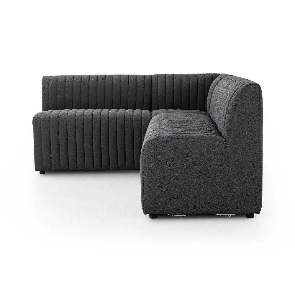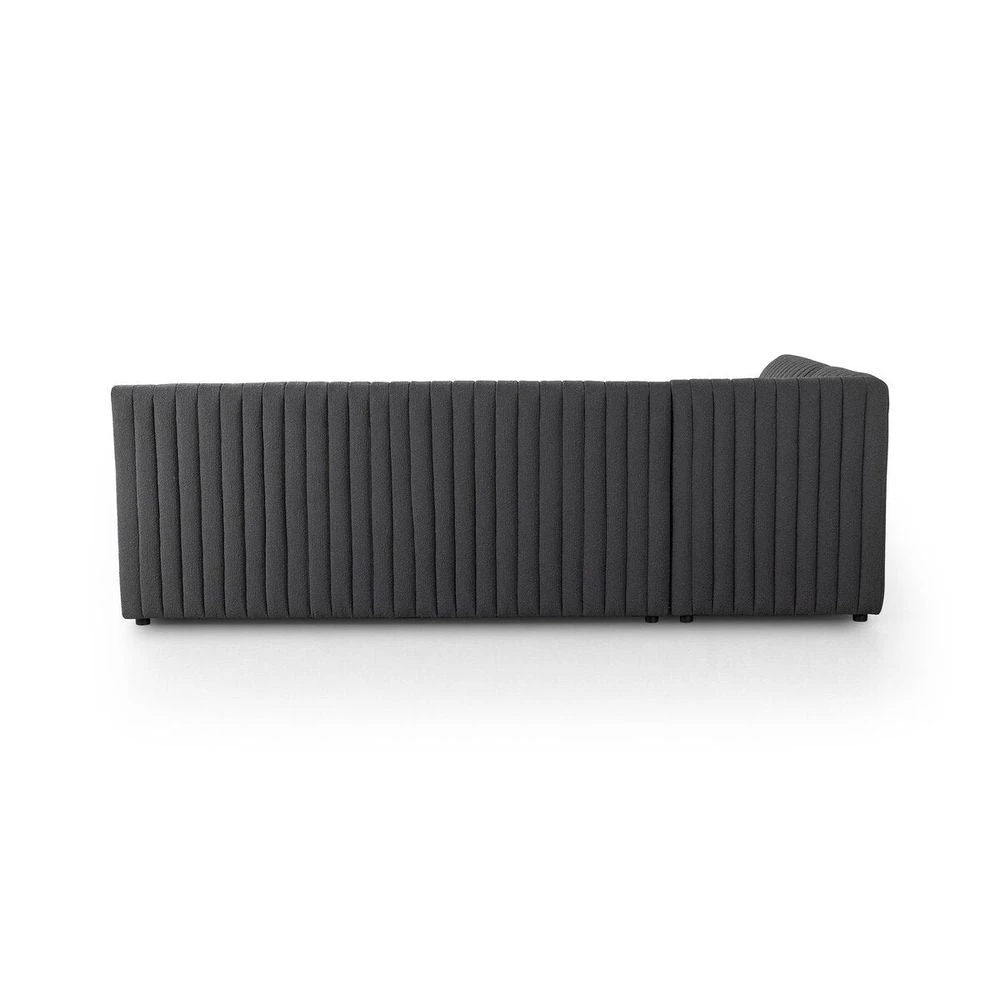 ‘Charcoal high-performance boucle features dramatic channeling for texture and comfort alike. Option to pair with matching pieces for modularity. Easy to clean and made from fully recyclable materials, Fiqa fabrics are machine-washable, stain-resistant, water-repellent and antimicrobial.