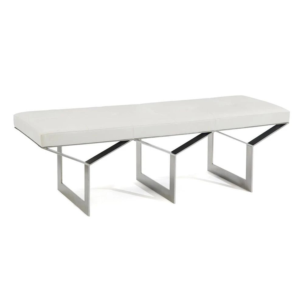 Description: This transverse bench is tailoreded in a chalk white leather with a steel structured base hand finished in Silver Leaf
