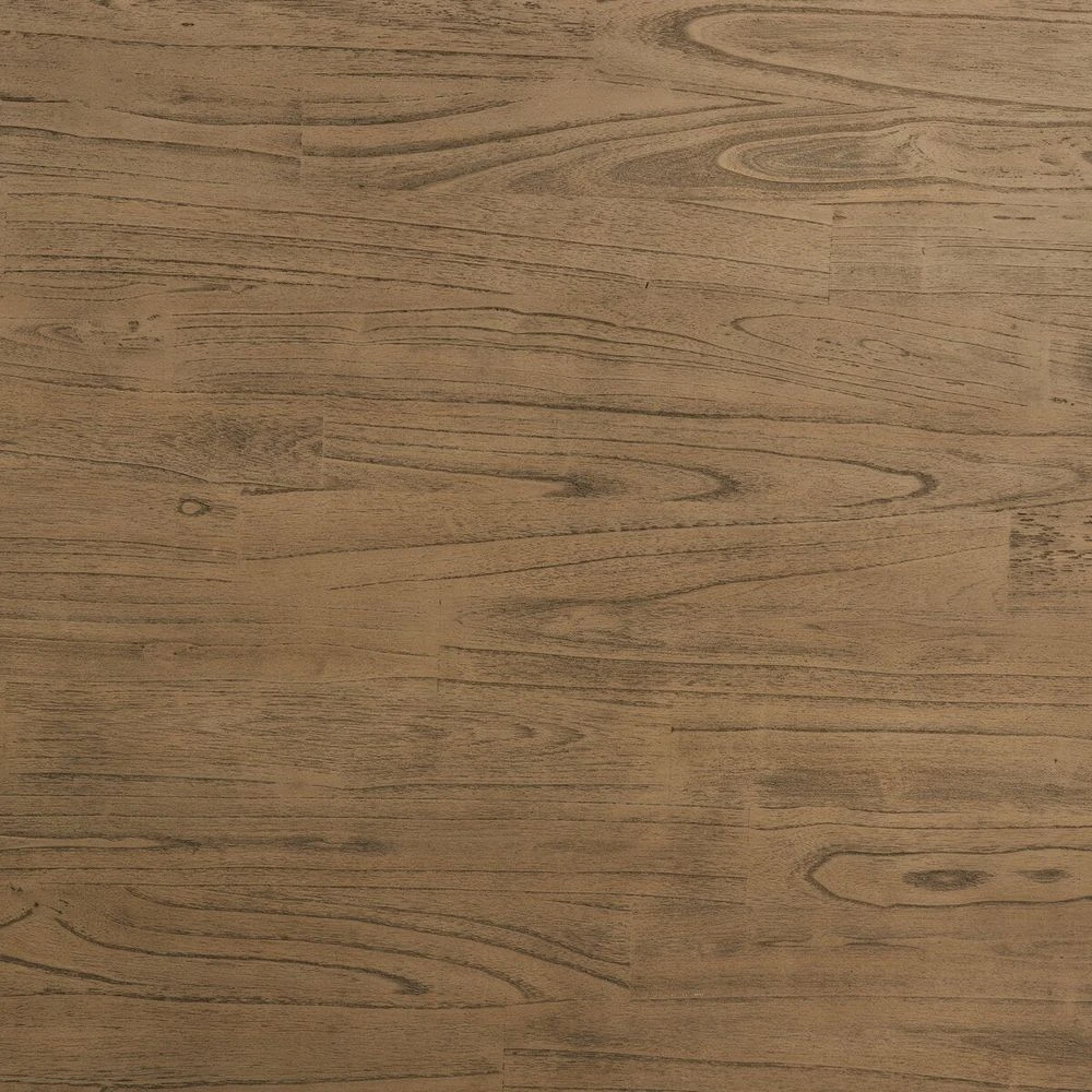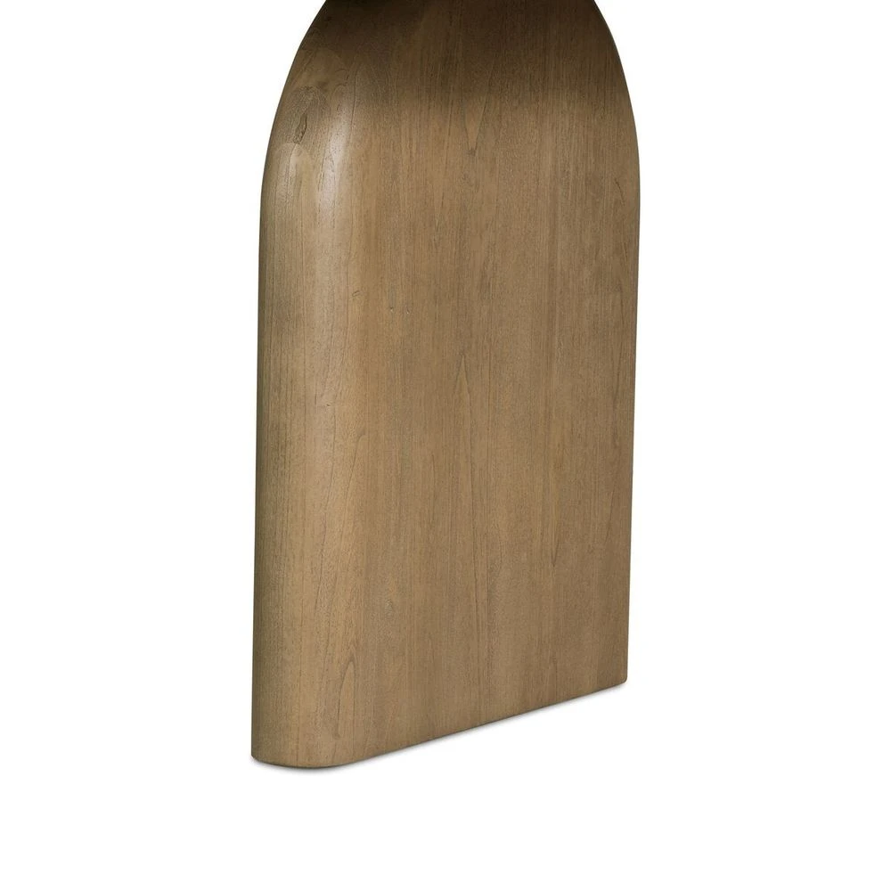Clean edging and soft curves spur a remarkable contrast. Solid aged mindi forms an open, minimalist-minded dining table with grand proportions above arched bases. Seats up to 12 comfortably.