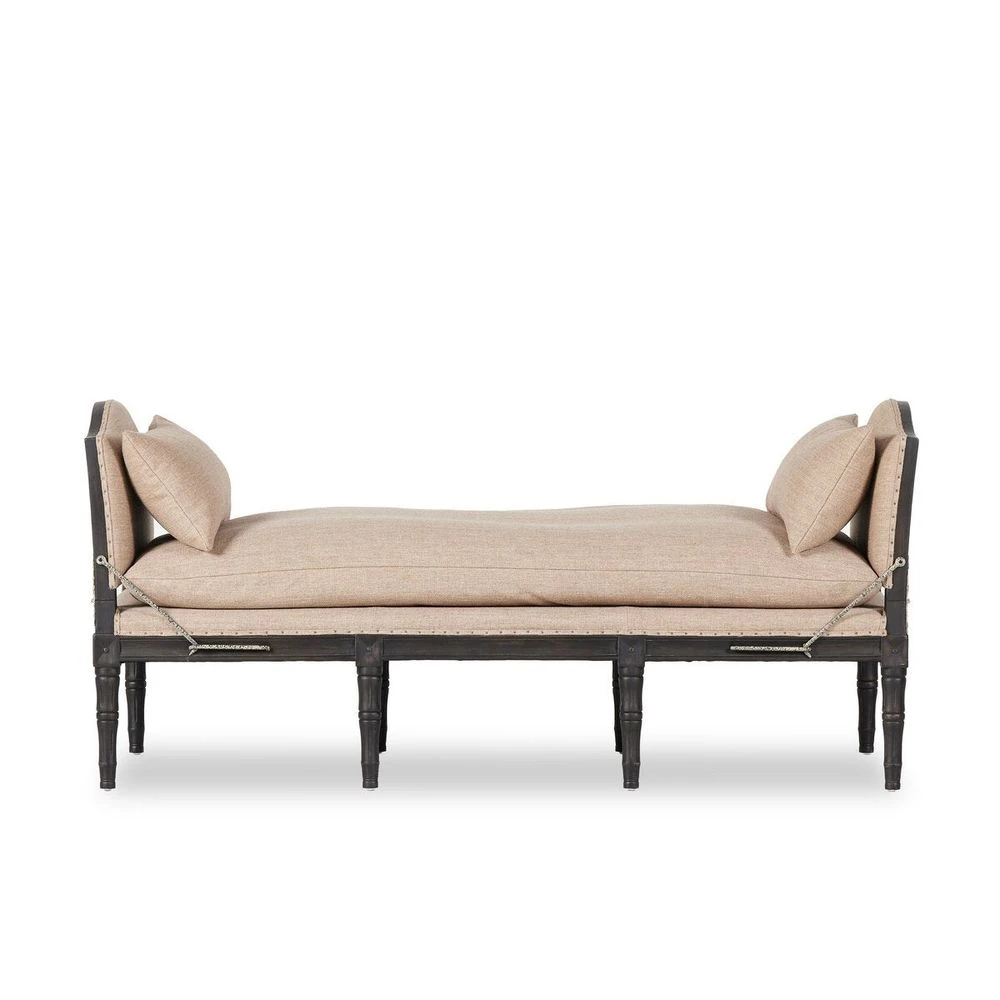 Play up a sense of French chic with a chaise featured and styled to look relaxed. Natural linen, spit tack and iron fleur-de-lis detailing.