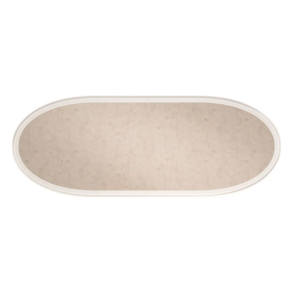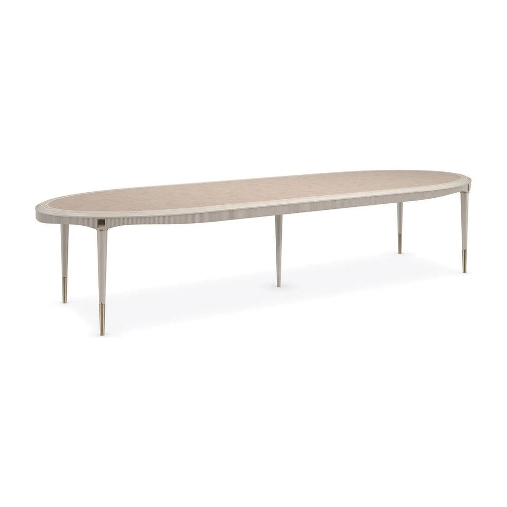 With an elegant oval shape accentuated by a gently flowing, reeded apron, this extension dining table celebrates attention to detail and functionality. Its expansive top is intricately crafted from pieced maple burl veneers, trimmed in a cream silkscreen banding to complement its Matte Pearl frame. Corner blocks add a distinctive finishing touch atop tapered round legs, capped in a Whisper of Gold metal ferrule to emulate the apron’s subtle curves. Comfortably seats 12 when fully extended.