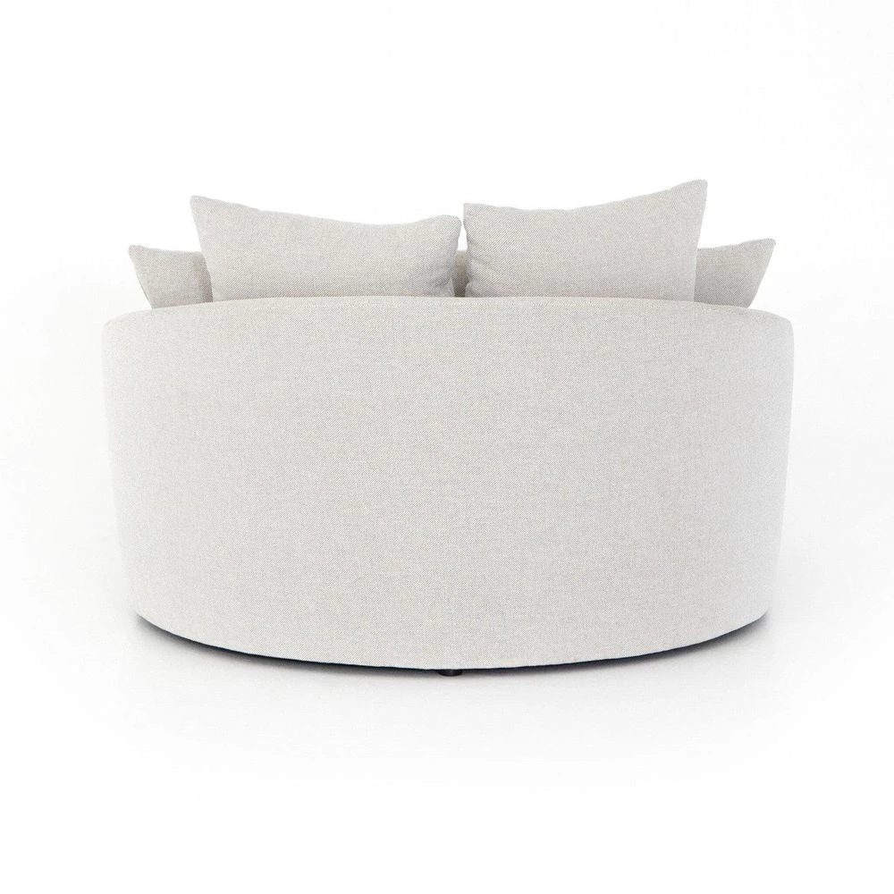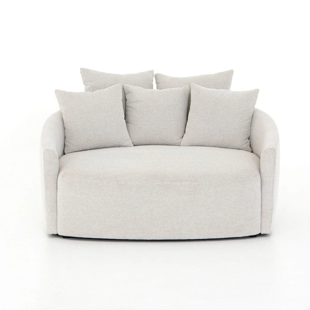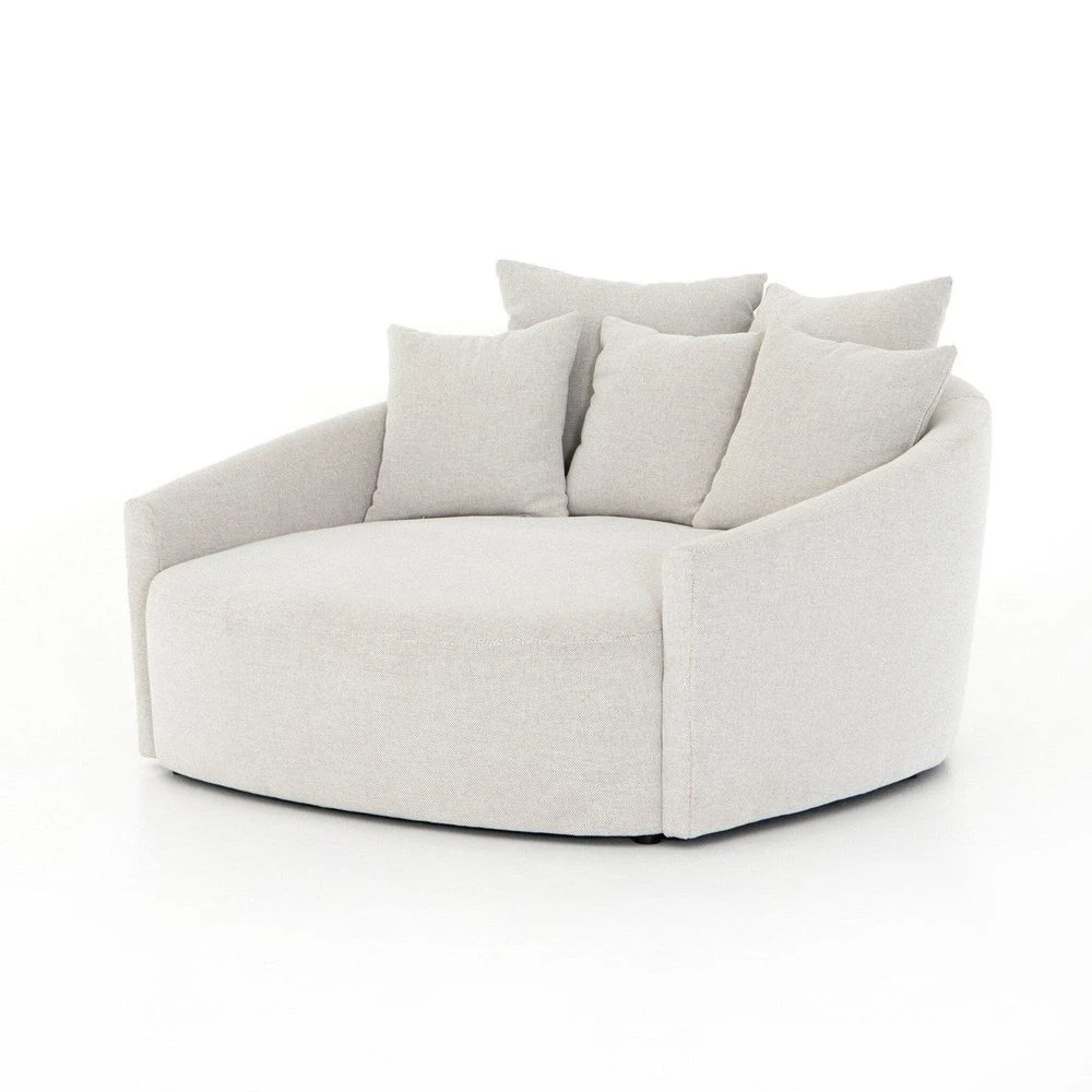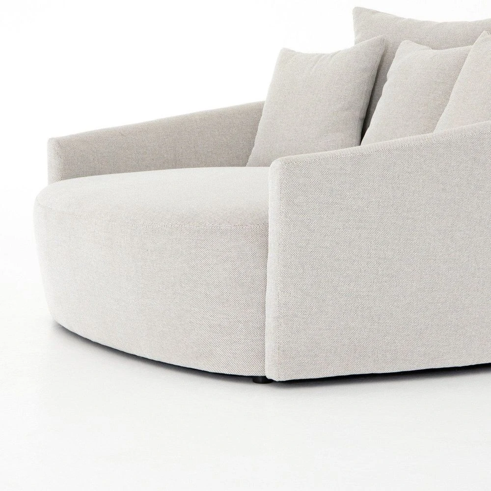 - Description: Roomy style. Off-white high-performance fabric covers a dramatic U shape for a spacious, sink-in sit. Throw pillows present an added touch of comfort to this sensibly styled media lounger, perfect for movie nights.
