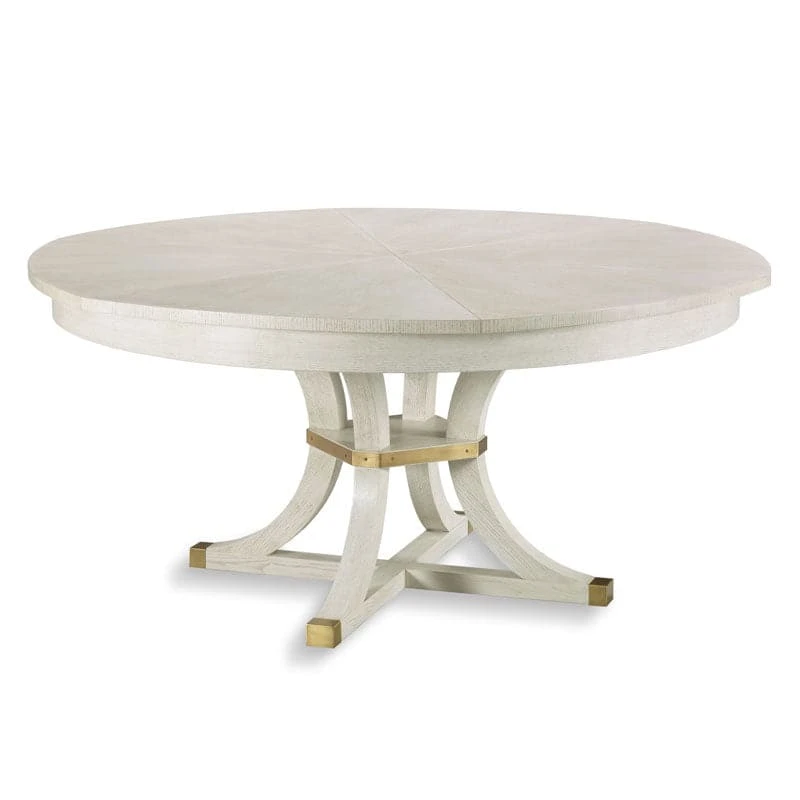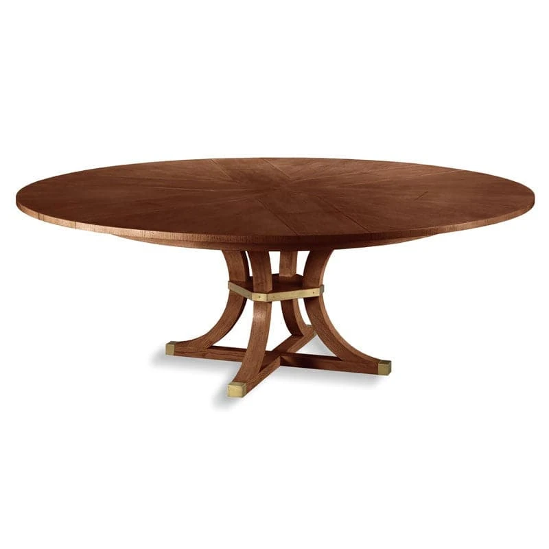 A wonderful expanding table with transitional styling. The top expands using a patented mechanism dating back to 1835 by Johnstone, Jupe & Company. The top expands from 66″ to 84″ Diameter and rests over four saber legs that are joined at the center with brass mounts.