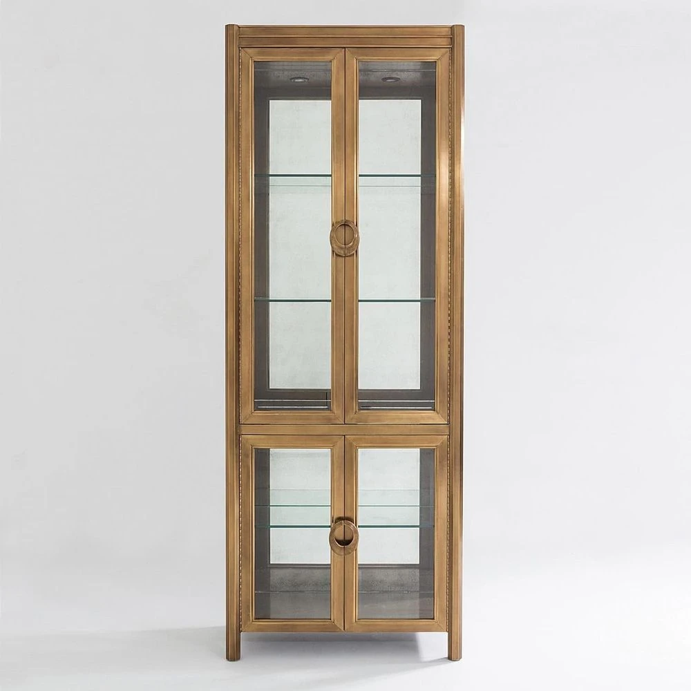 A tall, stately piece of furniture made from an MDF frame and support clad in solid thick brass sheet material. Two compartments, upper and lower, with four shelves- three adjustable, one fixed between the levels. Antique mirror interior back panel. Beveled glass on all doors and side panels. Two sets of sand casted solid brass handles that have been custom made and designed for this piece specifically. Two upper LED lights shine all the way from the very top of the piece through the series of glass shelves to the bottom shelf of the item. Apothecary is one term for a medical professional who formulates and dispenses medical materials to physicians, surgeons, and patients. The modern pharmacist (also colloquially referred to as a chemist in British English) has taken over this role. In some languages and regions, the word “apothecary” is still used to refer to a retail pharmacy or a pharmacist who owns one. Apothecaries’ investigation of herbal and chemical ingredients was a precursor to the modern sciences of chemistry and pharmacology. This definition of apothecary should help you well imagine how many wonderful, useful, and other oddities could be displayed within this beautiful elegant vitrine.