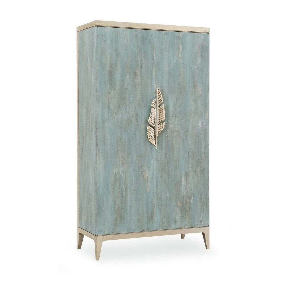 A piece of art is not always found on a canvas. Our custom-painted Watercolours cabinet is a piece of art that also solves a variety of functions in your home. Distinguished by its impressionistic Tranquil finish in greyish blue/aqua that has been kissed with silver leaf, it will literally shimmer in any room. In true style, our custom-designed, asymmetrical, metallic palm frond door pulls enhance this piece of art. Watercolours is sized to hold a 42-inch television. Additional features include a pull-out writing surface with cord access, two adjustable shelves behind sliding doors, as well as two drawers and two file drawers. Finished with a warm Coastal Silver Leaf plate cap and base, this piece functions as an office, entertainment center or bar with equal fluidity.
