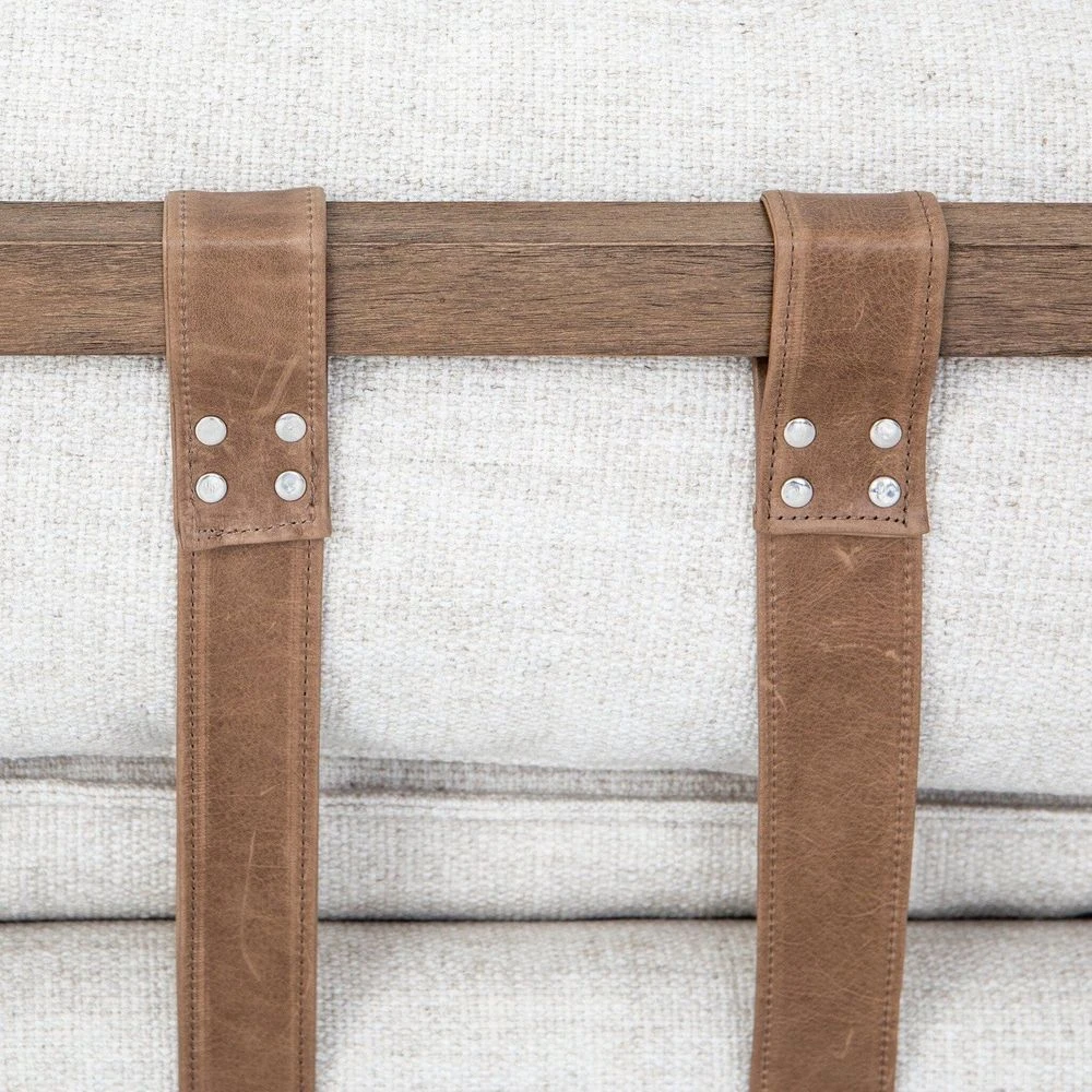 - Description: Made for stretching out or sinking in, cream-colored pillowtop cushioning is cradled by a natural parawood frame, with taupe top-grain leather buckles lending an edgy finishing touch.