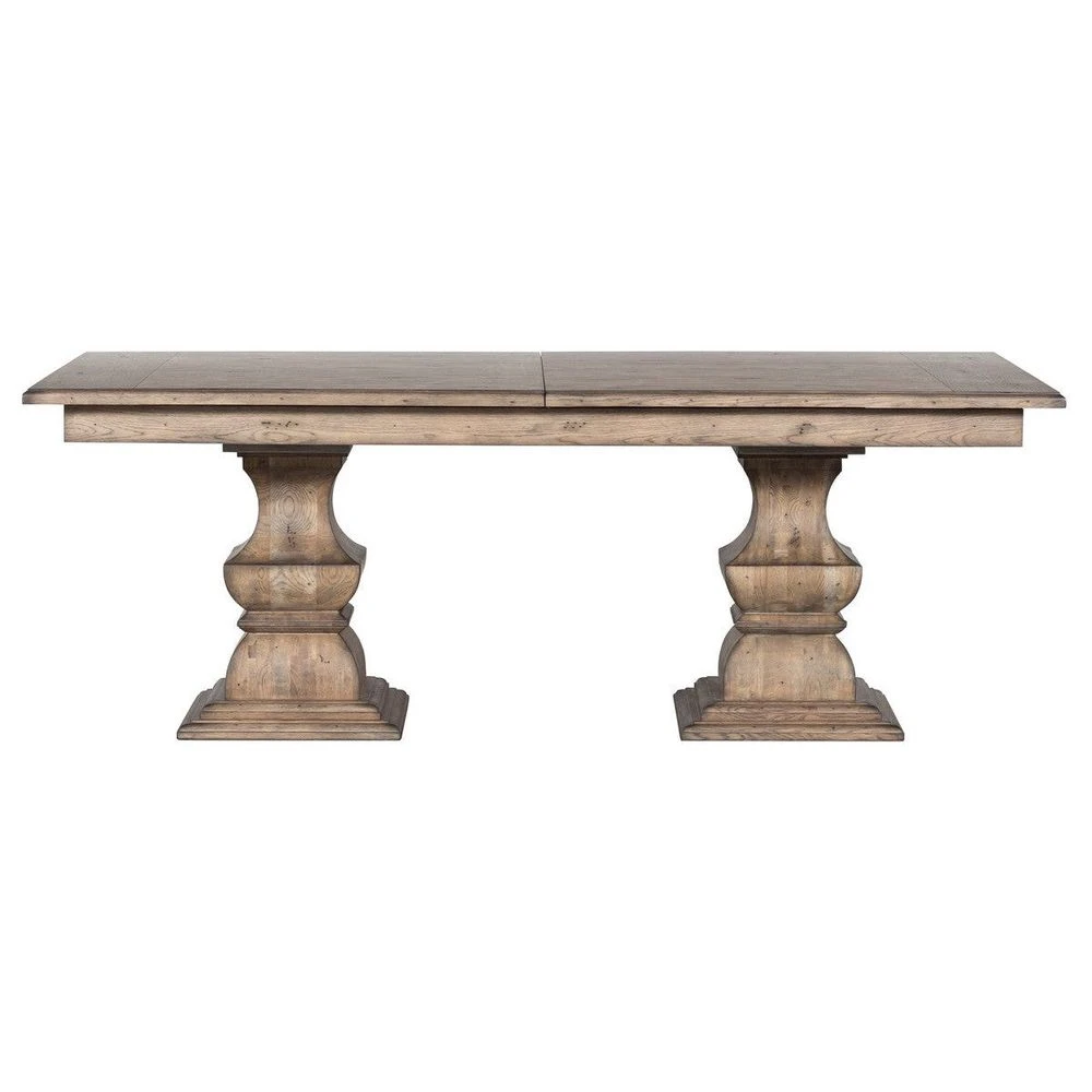 Feature Bullets: Finished in Burnished Oak. Features one 22″ leaf. Width with 22″ leaf is 106″ and without leaf is 84″.