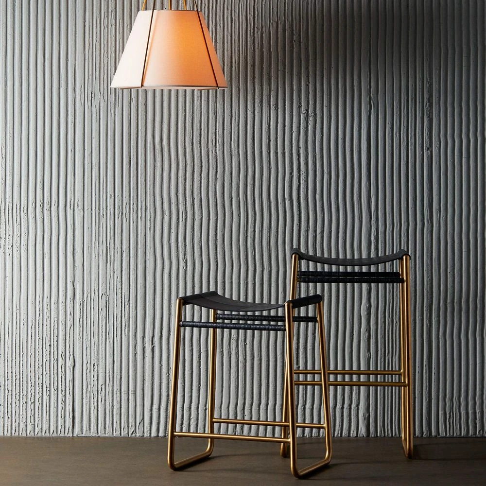 A marriage of form and function, this counter stool has a refined meets rustic vibe. An indigo leather seat lends an organic touch to the modern style of its antique brass frame. The top stretchers on either side have been wrapped with matching leather to create cohesiveness. The unrestricting design of no back or arms creates a minimalist profile, which makes this ideal to tuck under a counter. Finish and leather may vary.