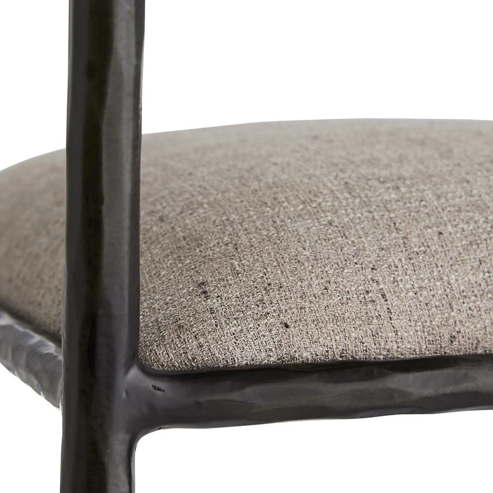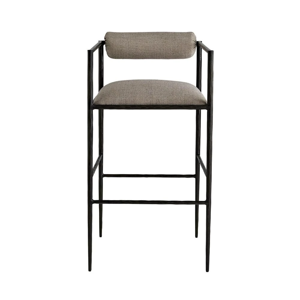 This exquisite stool is perfectly poised, perched on delicate legs that are as faint as insects’. The natural iron body has been hand-forged, yielding soft impressions along the sharp-angled frame. The tight seat and bolster back cushion are covered in a luxuriously textured pewter poly-blend. Finish may vary.