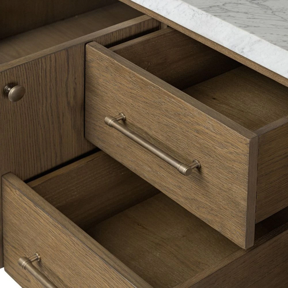 Set the tone for a calming, peaceful space with this simple, yet spacious design. Crafted with a wire-brushed, thick oak veneer base for added character, a Carrera marble top and solid brass hardware. A mix of drawers, cabinets and open shelving offers a variety of storage and styling options. Finished with a bath-safe sealant for moisture resistance. Designed to accommodate 8-widespread faucets and standard-size hardware for easy customization; faucet shown not included. Sink and backsplash included; backsplash ships separately. Removable back with cutouts for plumbing; fits standard P-trap. Professional installation required.