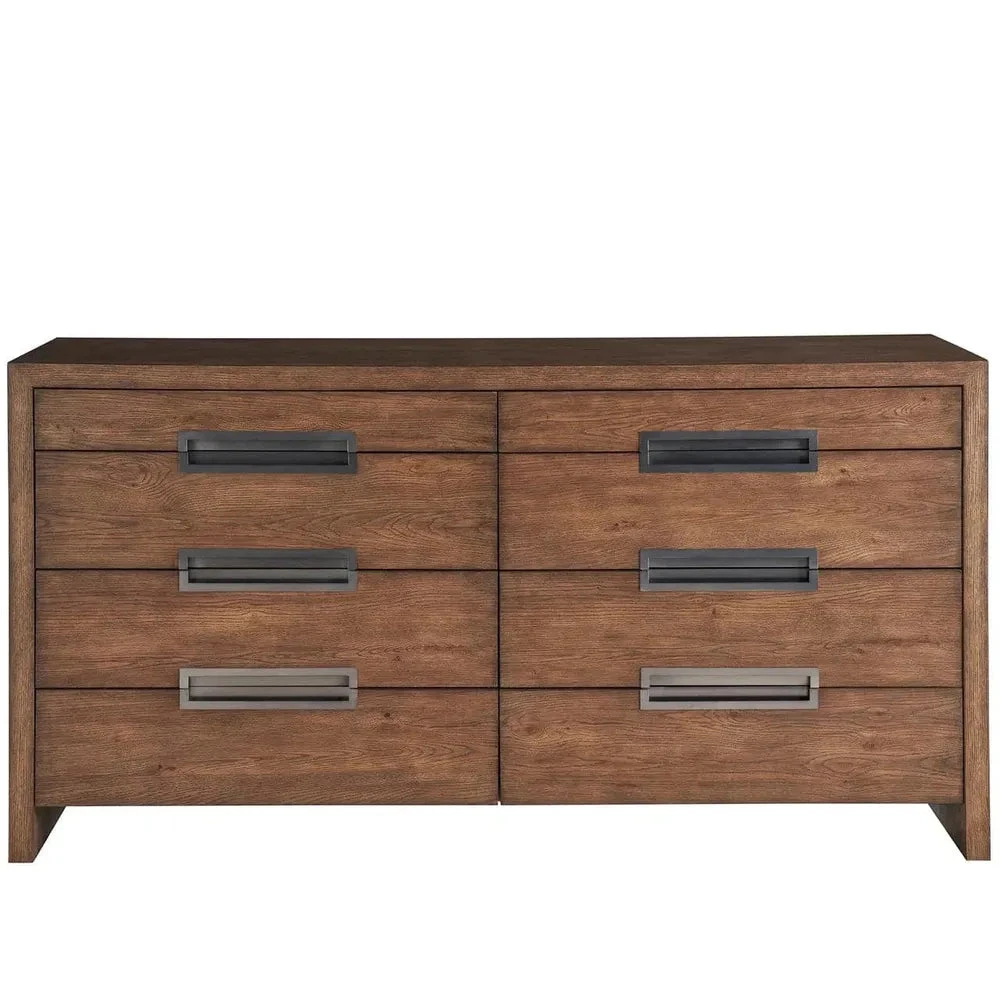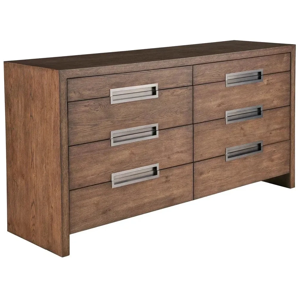 The Atlas Drawer Dresser presents a commanding presence with its eight drawers, finished in a medium Brown Oak. The design is distinguished by dark centered pulls, offering an astute and robust character that effortlessly anchors any room with a sense of refined strength and sophistication.