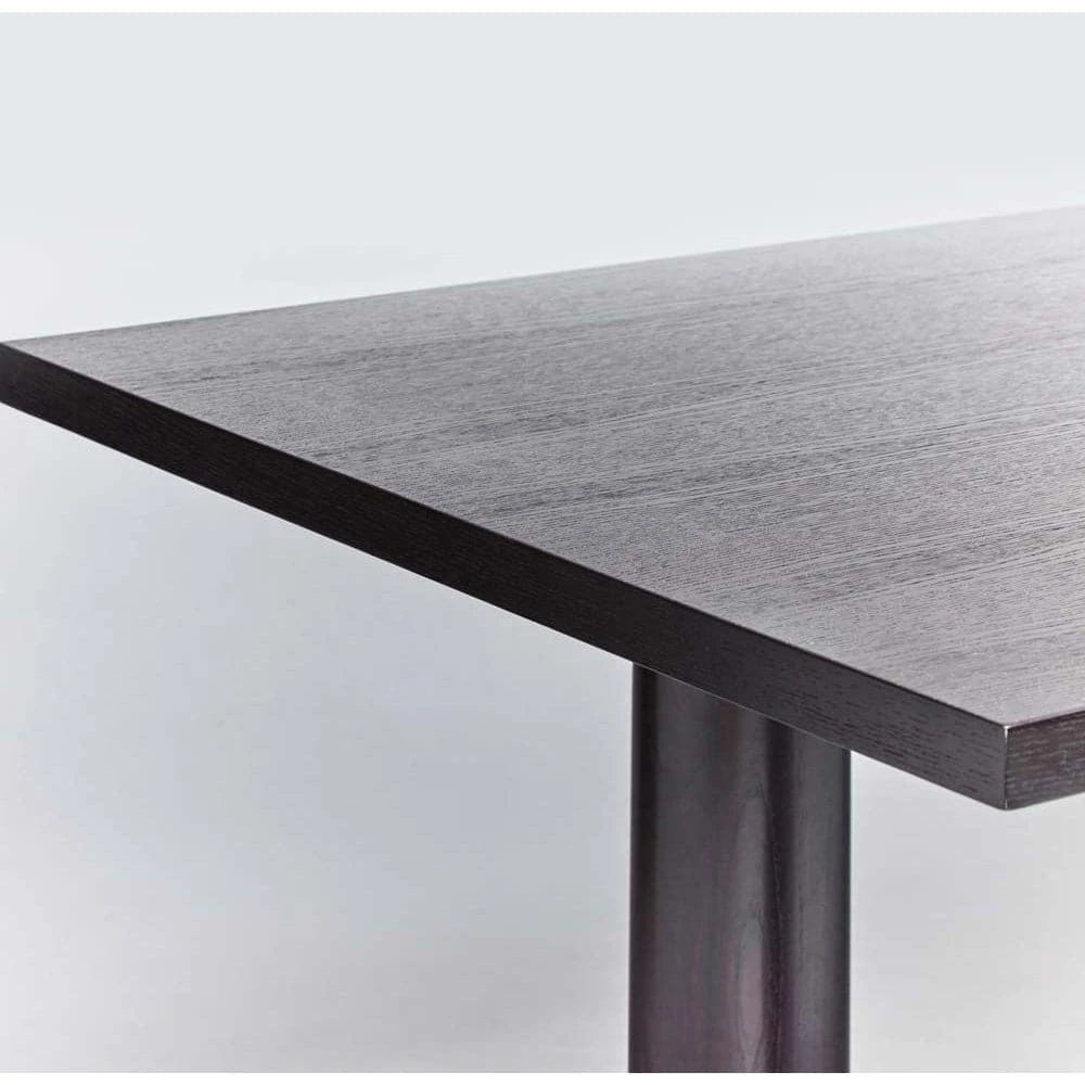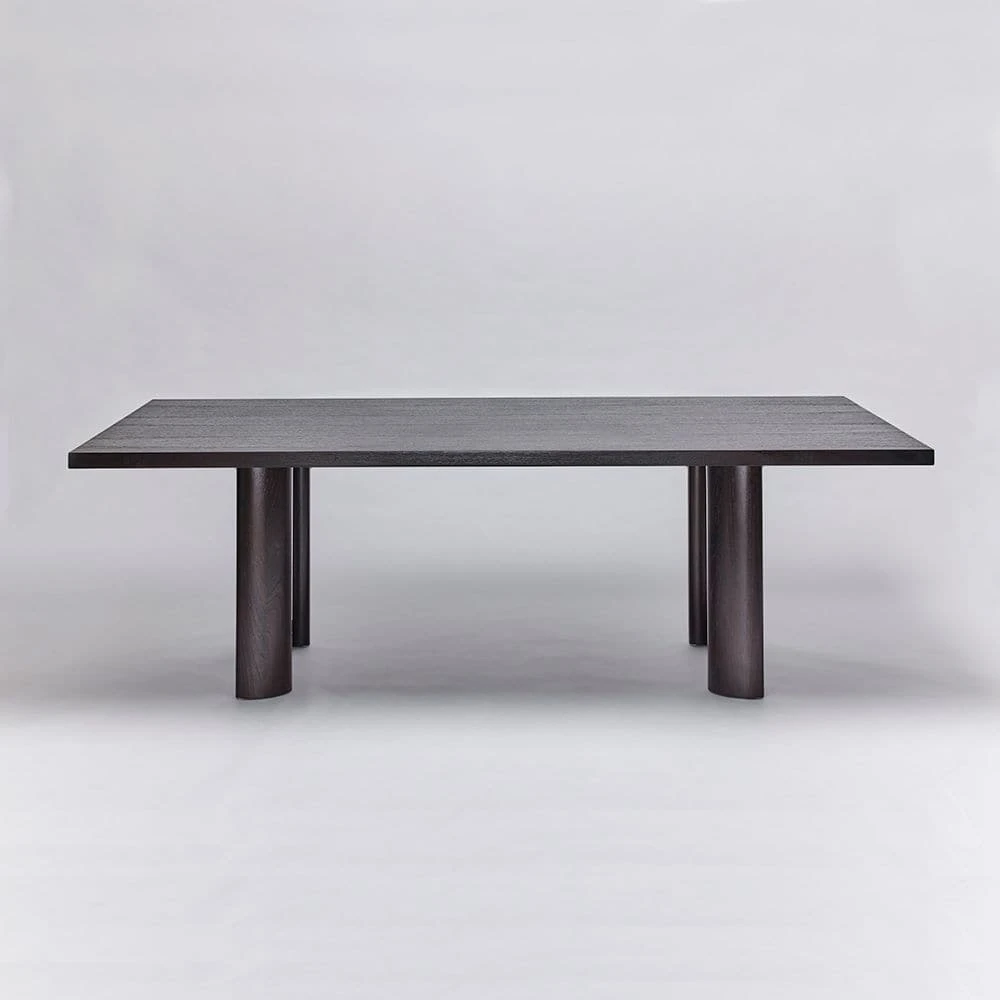 Juxtaposing a rectangular surface with rounded oval legs, the oak Aubry Dining Table adds sophisticated drama to any meal thanks to its rich coffee finish and bold size.