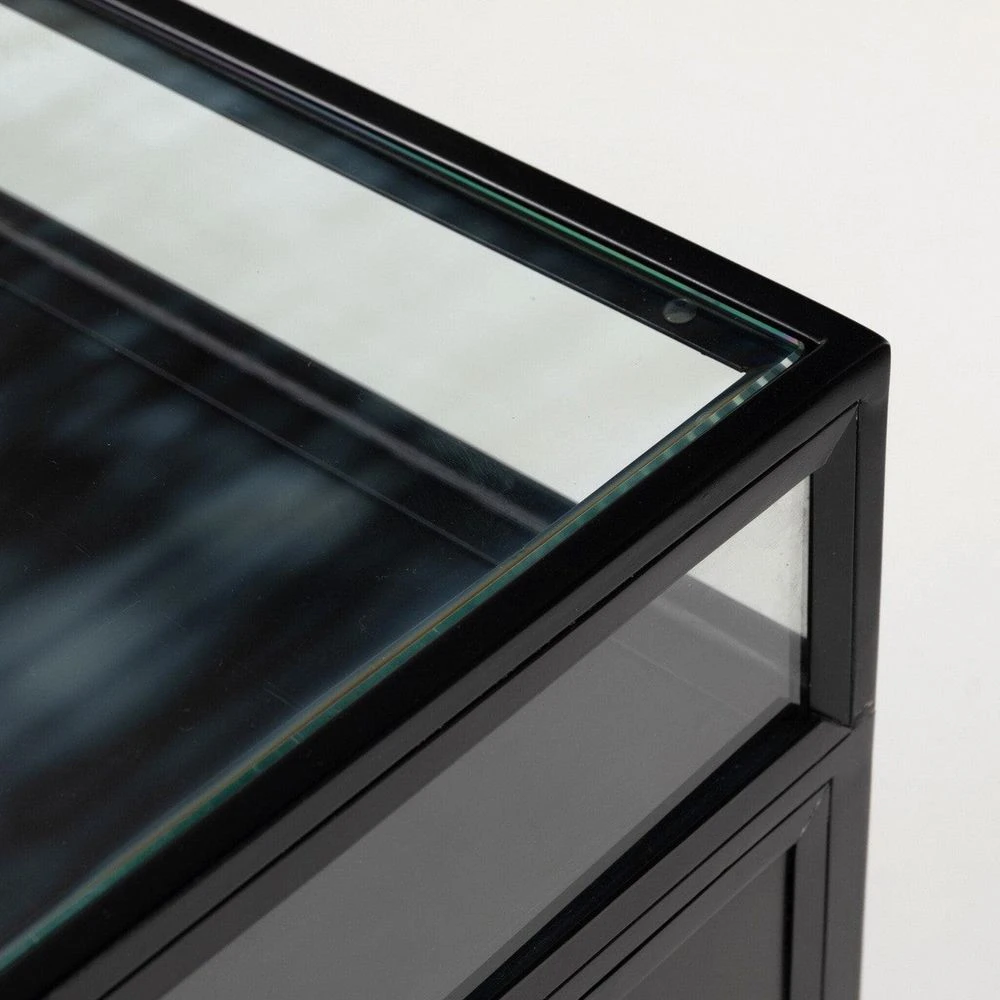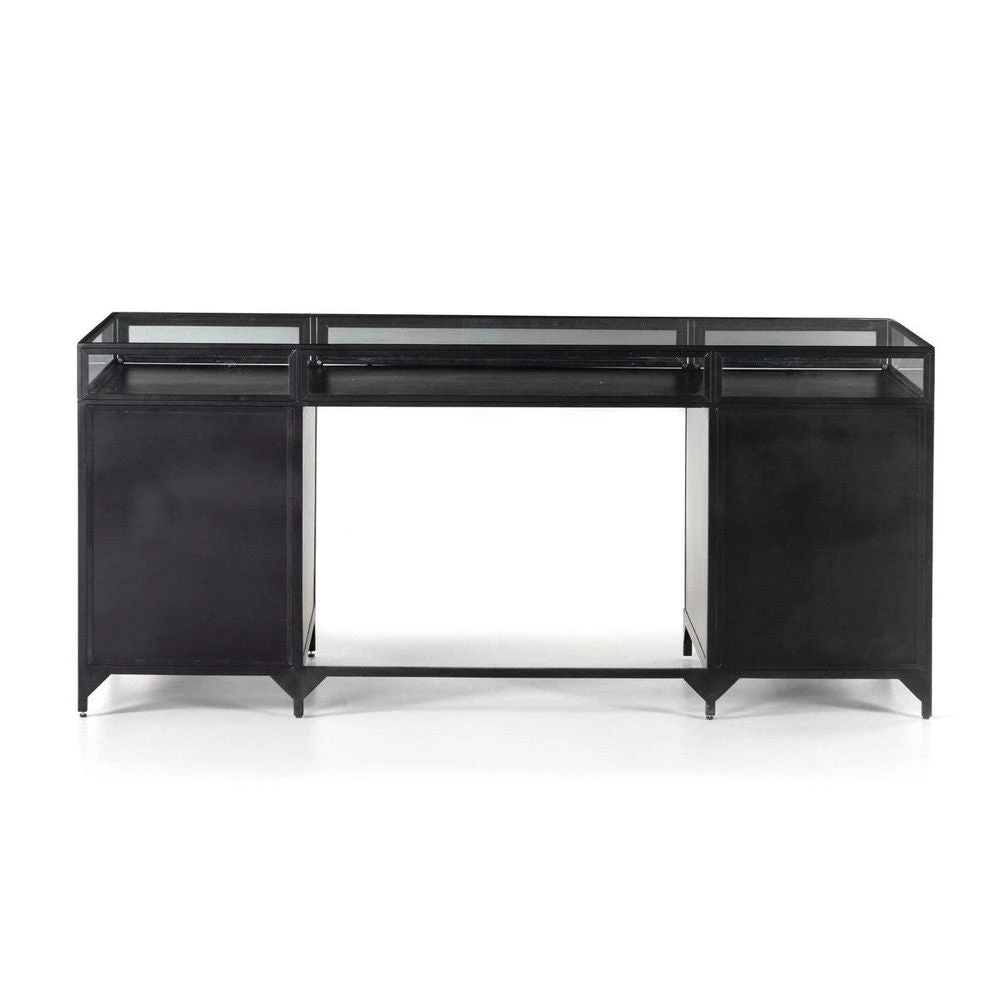 - Description: A shadowbox-style desk balances work with play. Display prized possessions in a glass enclosure with matte-black metal and brass knobs. Roomy file drawers for handy storage of legal and letter sized documents.