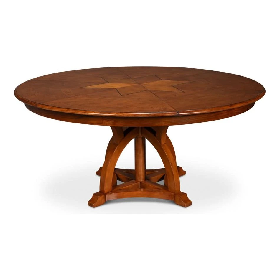 The Austin Jupe Table has an exquisite pedestal base that was inspired by timber frame architecture. The top has a unique inlaid star pattern that expands as you open the leaves. Sarreid”s newly reengineered Jupe Dining Tables bring a timeless 19th-century innovation into the modern age. Featuring a self-storing expansion mechanism crafted from extruded aluminum, these tables expand effortlessly, providing both smooth operation and simplified assembly.