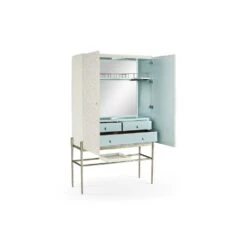 The Avalon Sink Chest offers both beauty and durability with its Mahogany craftsmanship and metal sunburst doors. The elegant circular brass pulls and antique brass finish add a touch of luxury, while the Primavera white marble top and undermounted porcelain sink provide long-lasting quality. Please note that the faucet shown is no longer available.