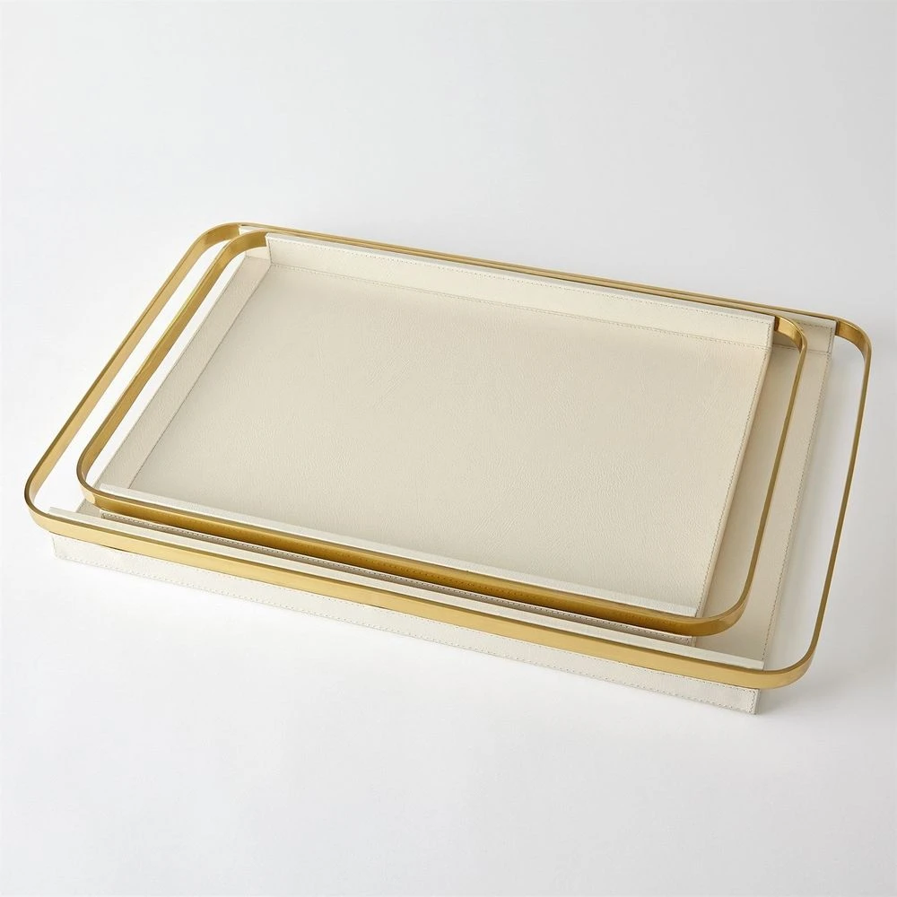Description: Our Avery Collection of boxes and serving trays are meticulously crafted in handsome milk leather accented with highly polished chrome hardware. Useful and purposeful, these are also decorative and add a dash of sophistication to any home office or room setting. The boxes are available in 3 sizes, and the serving trays are available in 2 sizes. Each sold separately.
