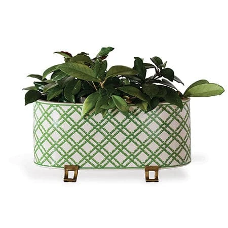 The oval planter is scaled for multiple plants or fresh flowers. Accented with solid brass feet, the planter makes a grand statement on the sideboard or at the foot of the fireplace.