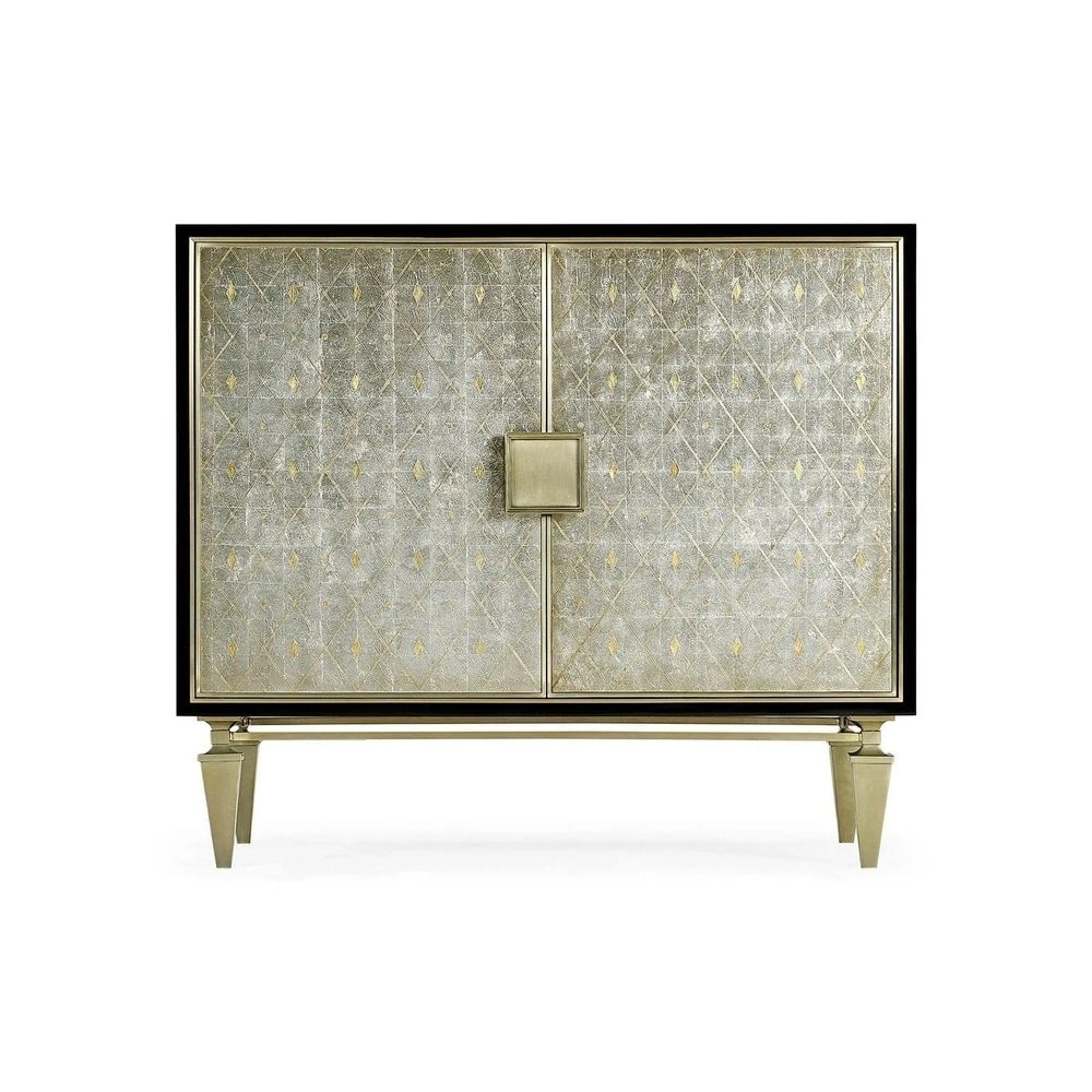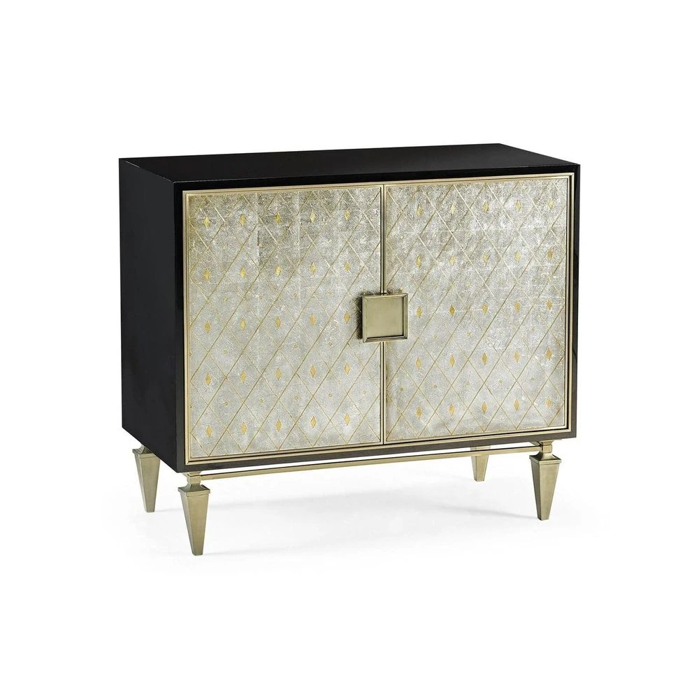 Inspired by French eglomise, the doors feature antiqued gold and silver leaf in a traditional harlequin pattern. Case is finished in a hand rubbed black lacquer. The base and hardware are cast in our foundry and finished in a light champagne patina.