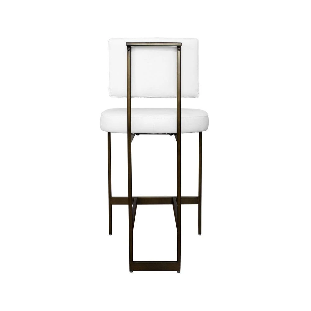 Description: The clean lines and simple geometry of our Baylor counter height stool are inspired by early European modernists. A versatile white vinyl cushion pairs in elegant contrast to the painted bronze base. Sturdy back handle incorporated into the metal frame for easy portability.