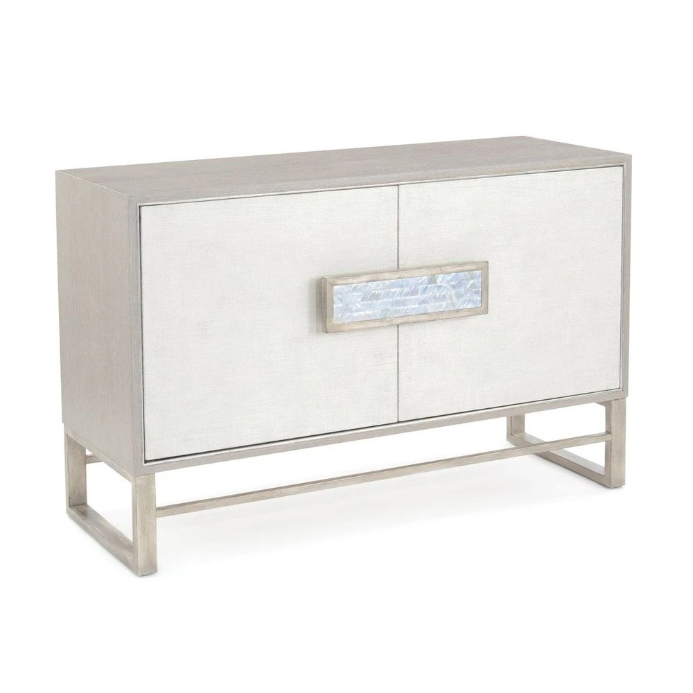 Description: This two-door cabinet features an oak veneer and a steel base. The case is finished in grey oak, while the doors are in white linen with silver cerusing. A single handle with inlaid mother-of-pearl is mounted across the doors. The handle molding and steel base are in silver white.
