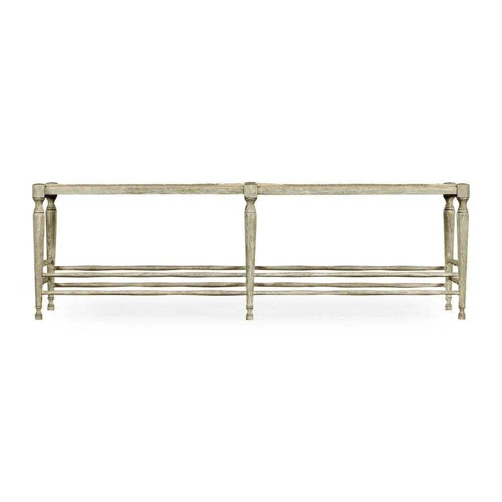 The Bodiam bench constructed of oak with a greyed oak finish is perfect at the end of a bed, as a coffee table in a casual living room, or smart in a hall to put your hat on. I do.
