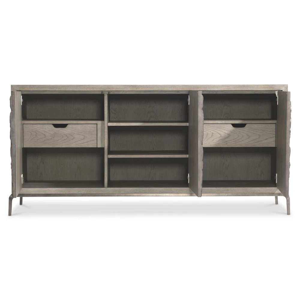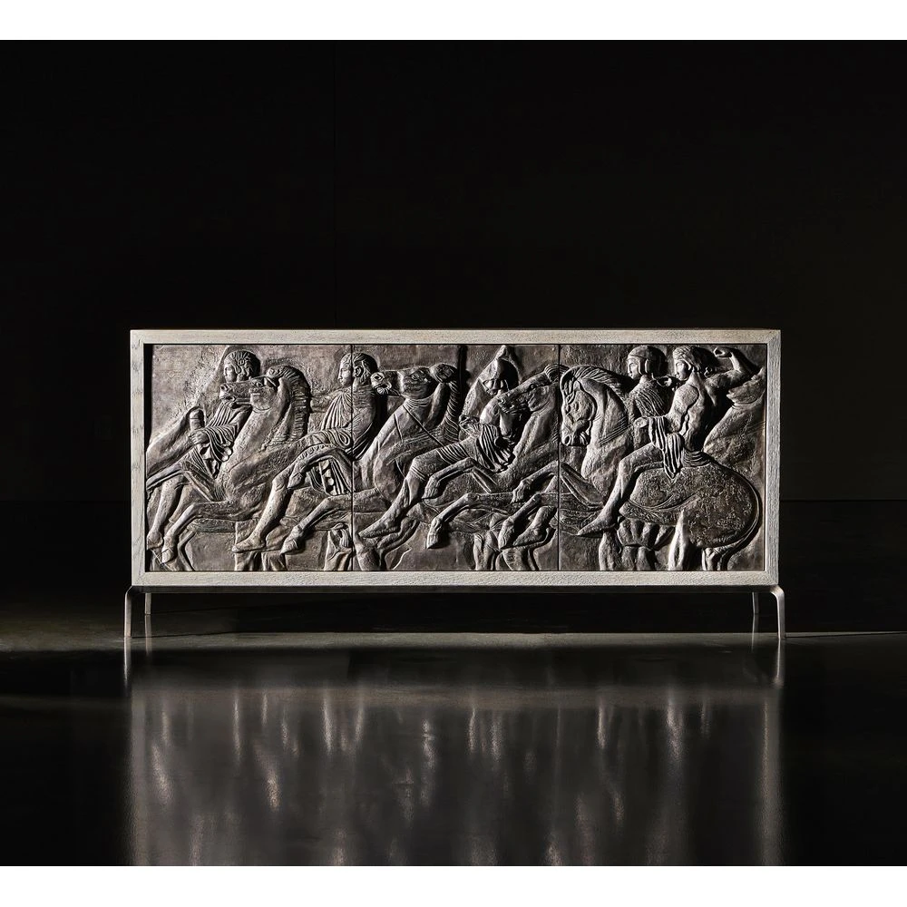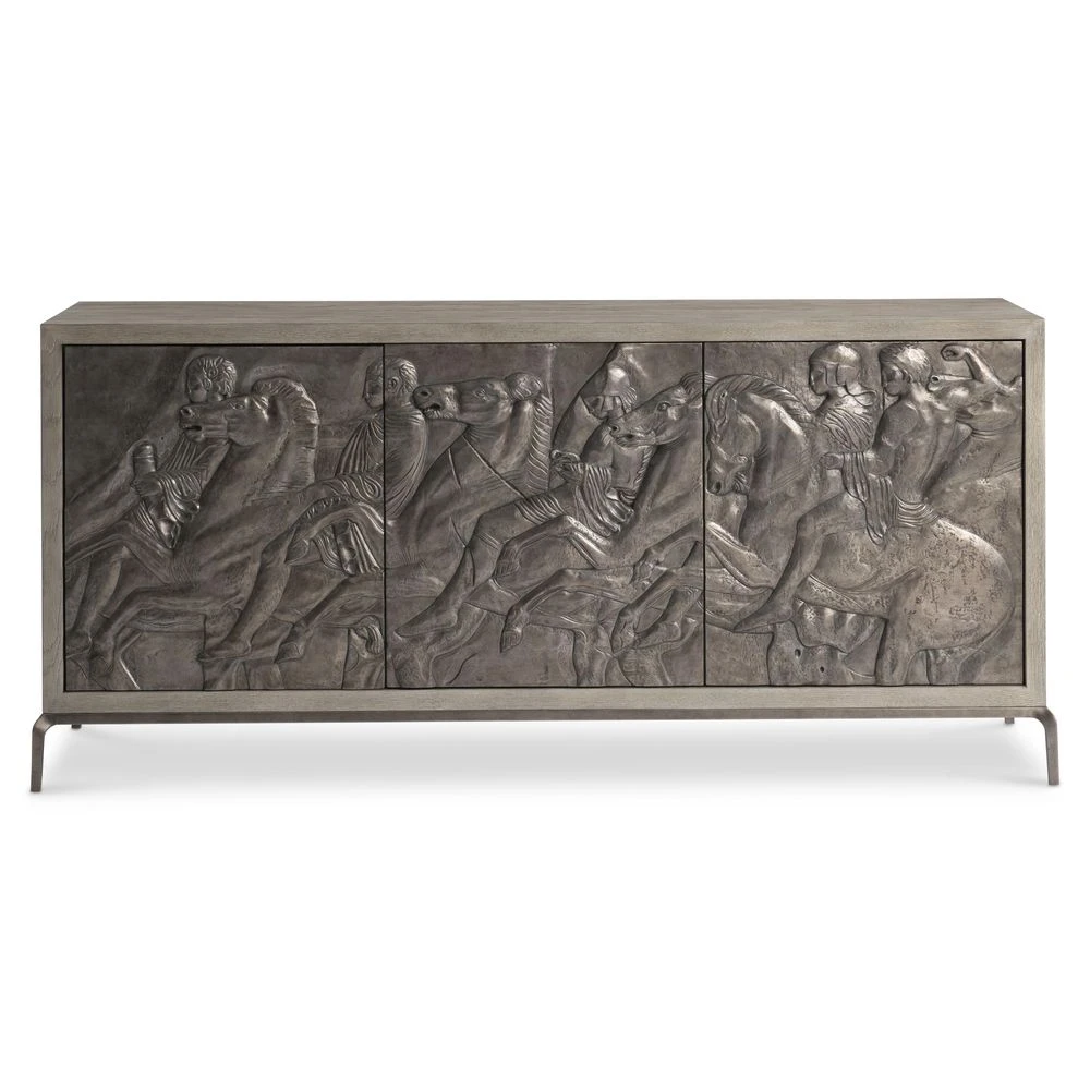Description: Showstopping drama inspired by a Greco-Roman frieze is the inspired design for the Bonar buffet. Three cast resin door overlays showcase a bold display of horses and riders, charging across the front in Dark Bronze finish. The wood case complements the look with a lighter Weathered Greige, with adjustable and fixed shelves inside. The buffets stainless steel base is also finished in Dark Bronze.