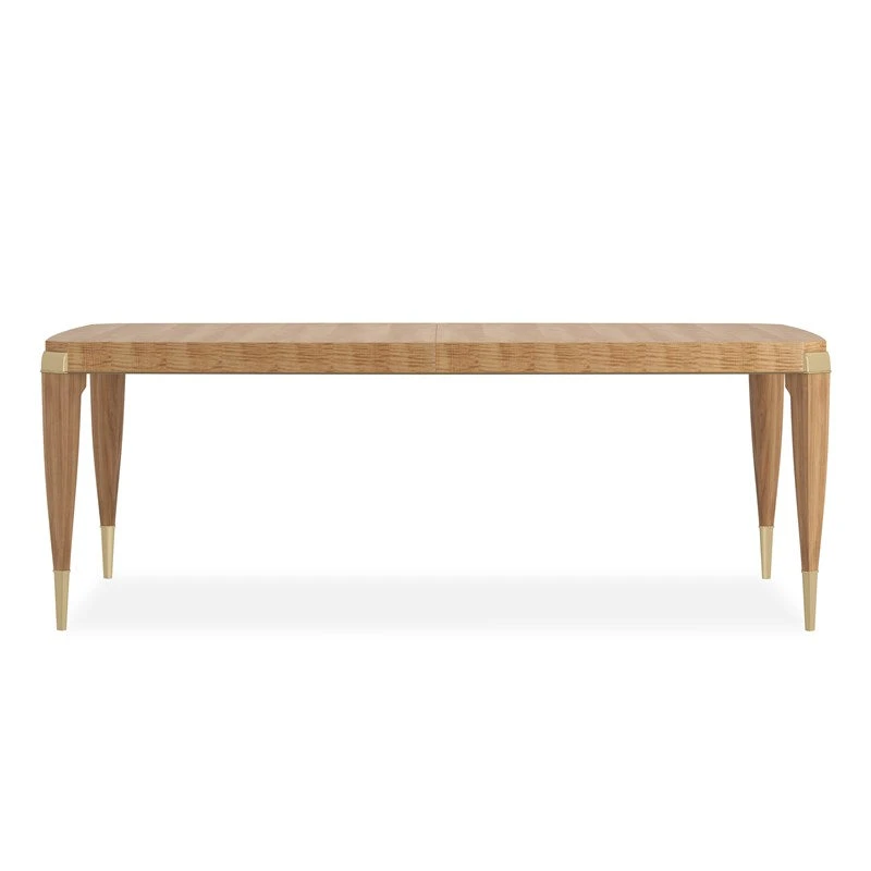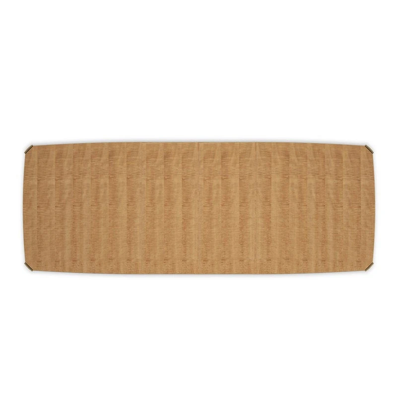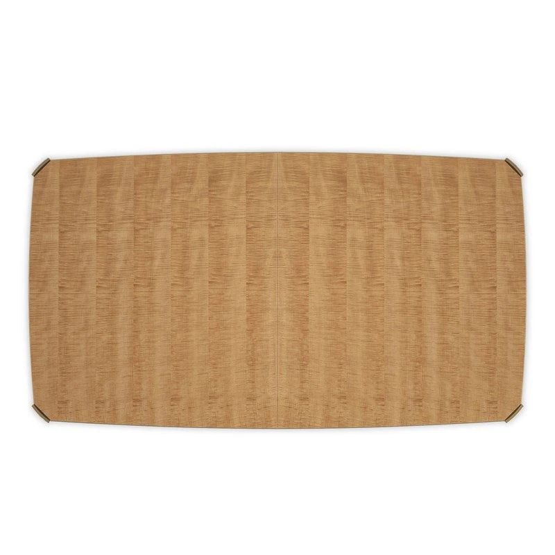 For large dining parties, this Toasted Sycamore table is unmatched. The delicately figured wood, in a bowed rectangular shape, has graceful chamfered corners detailed with outstretched, Whisper of Gold metal caps. The entire apron is rimmed in a thin Whisper of Gold bead as it sits on modern cabriole legs tipped in custom gold ferrules. For dining at its best, this piece is All Trimmed Out and expands from 83 inches to 123 inches with two 20-inch leaves.