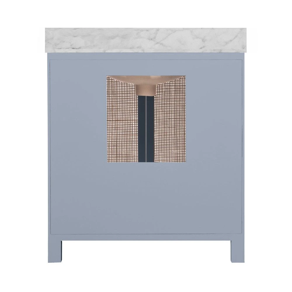 Description: With its bright and airy aesthetic, our Boyd vanity brings understated luxury to your Mid Century, Farmhouse or Scandinavian-inspired bathroom. Simple and refined, the natural cane door fronts are encased in matte light blue lacquer with brass knob hardware. Includes a white with grey accents Carrara marble top & backsplash as well as a white porcelain sink.