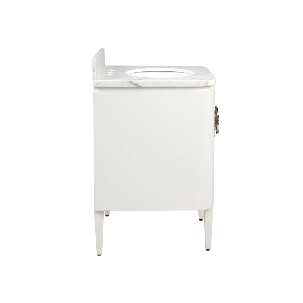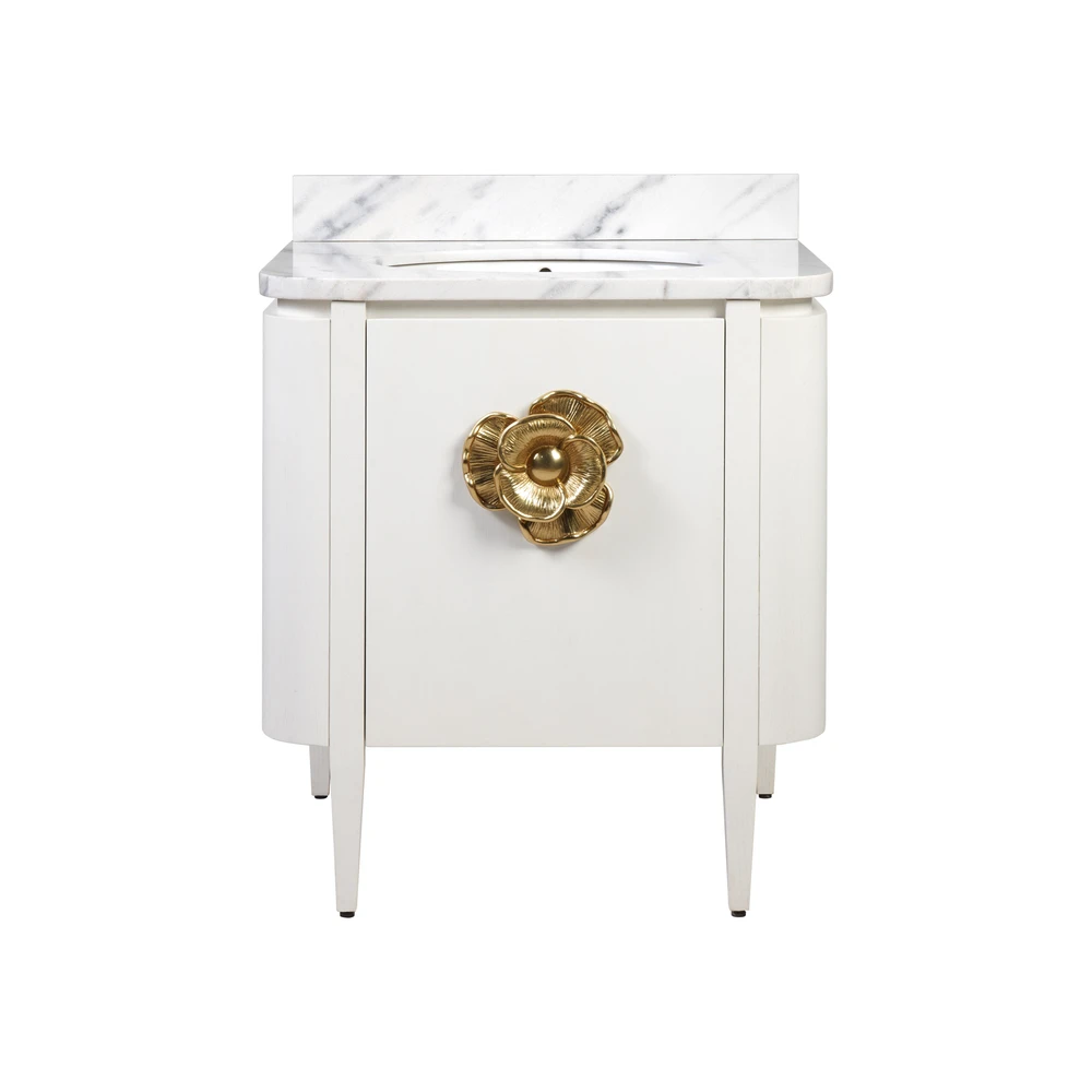 Description: The impressively sized brass flower pull on the Briallen 30″ White Vanity is a stunning ornamentation that contrasts the cerused white finish. The interior has one adjustable shelf and there is an optional wood tray that attaches to the inside of the door. The white Carrara marble top is fitted with a white oval undermount sink. Other fine design attributes include soft-close door hinges and a matching marble backsplash.