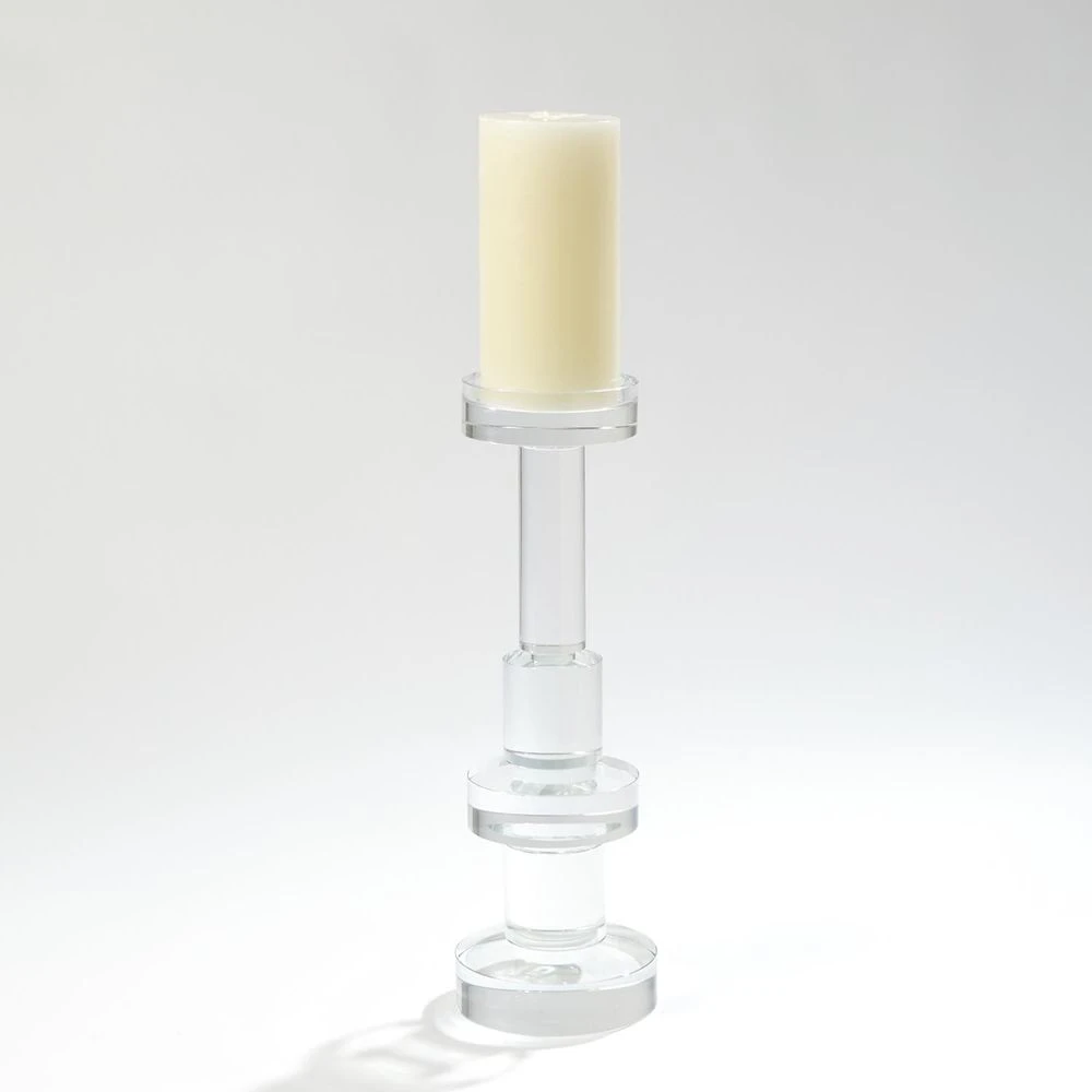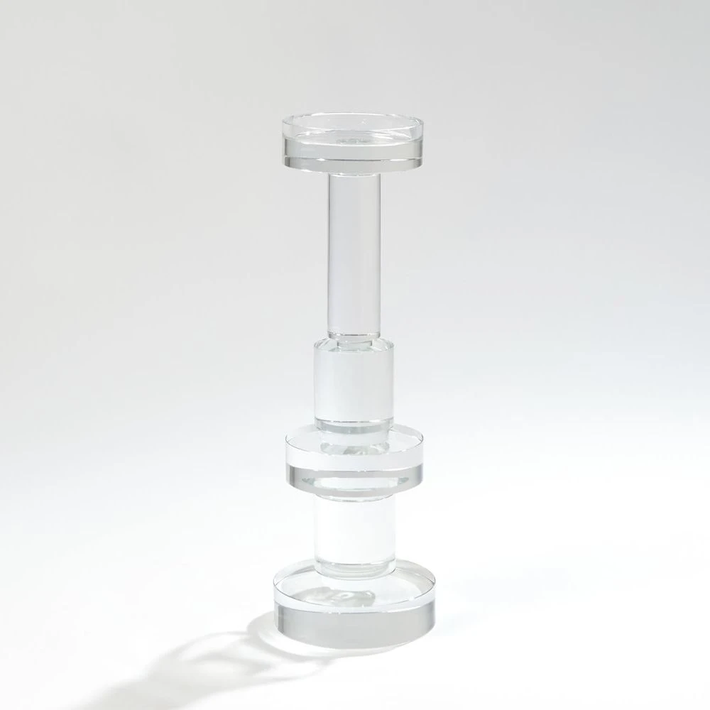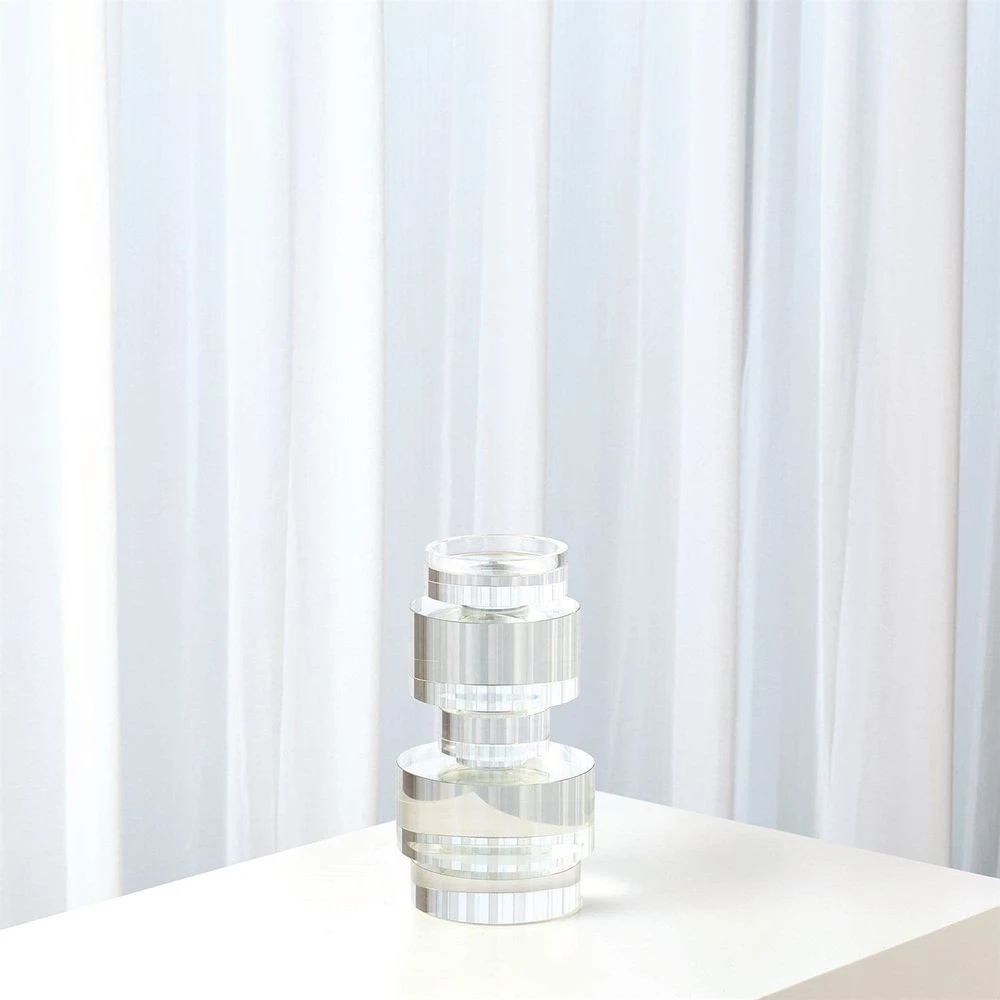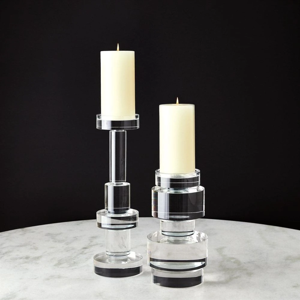 These over scale candleholders are made of lead crystal. Designed to complement each other, the polished crystal column also stand alone as stunning sculptural statements. Please do not place in direct sunlight, crystal can magnify the light of the sun and potentially cause a fire hazard.