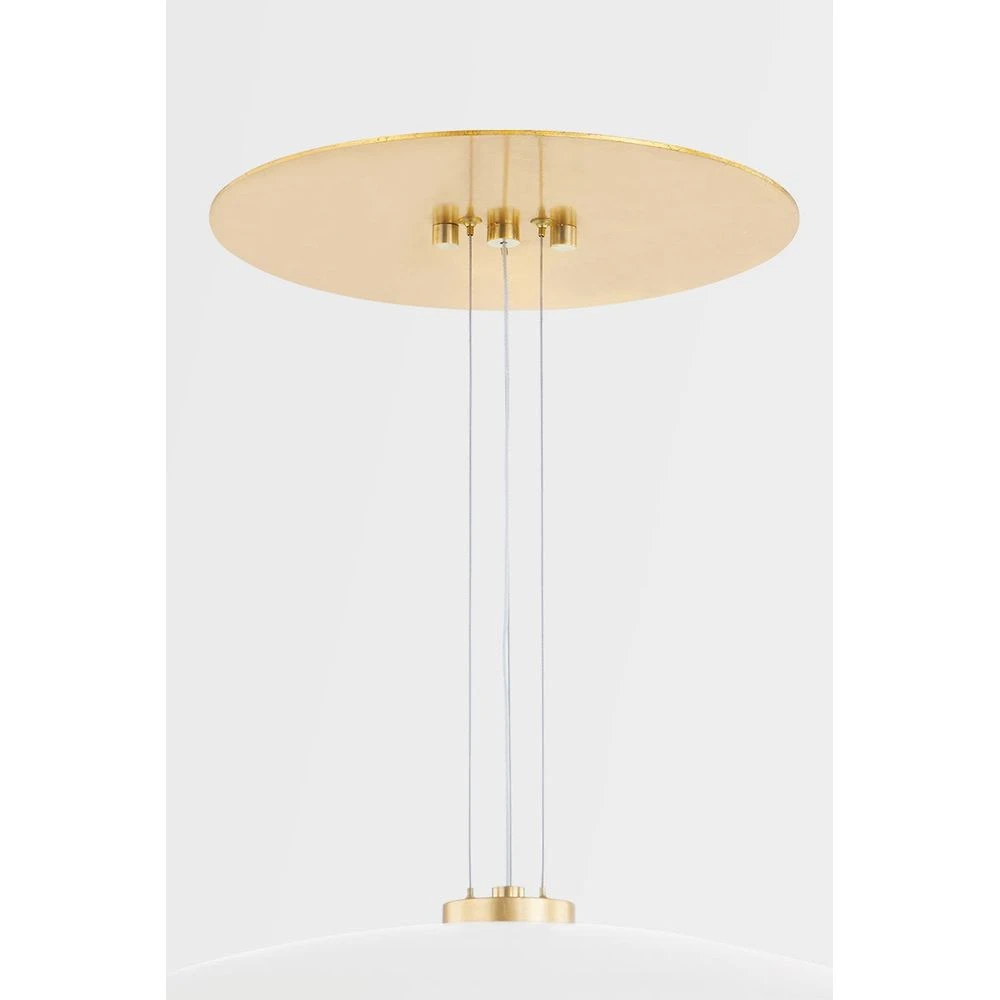 Clean, sleek and decidedly modern, Brim is full of style. The traditional pendant rod is replaced by a trio of thin wires that suspend the soft white plaster shade from the canopy. The wires extend below the shade, allowing the opal glossy globe to hover beneath, rather than rest inside the shade. This unique design allows light to fully flow from the globe and also reflect off the gold leaf shade above.