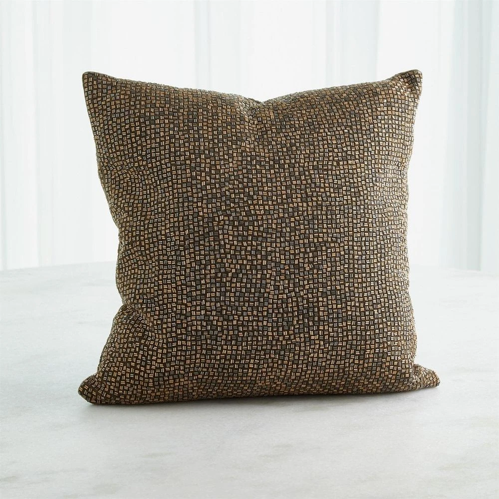 The Bugle Beaded Pillow is fully beaded with an alternating gold and gunmetal pattern. Down fill insert included.