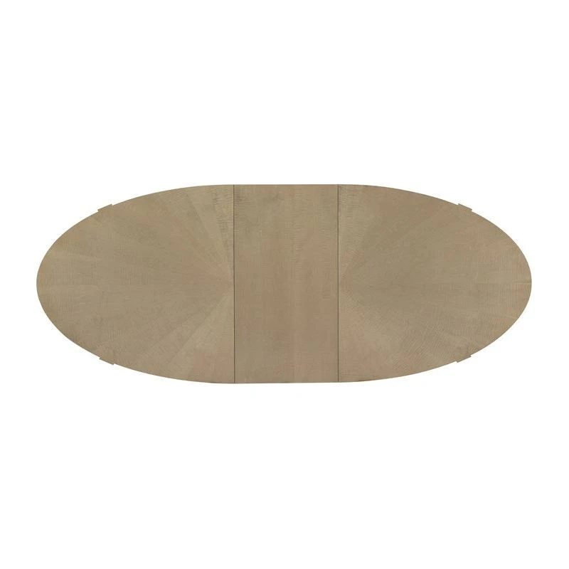 You’ll be inspired to gather friends and family more often with this lovely oval dining table. Its exquisite top features radial-matched Fumed Figured Tiger Maple veneers and is finished in Smoke with Taupe Silver Leaf accents. Ensuring room for everyone, the table extends to 138 inches with its two 24 inch leaves. Metal ferrules adorn its legs for a dramatic finishing touch.