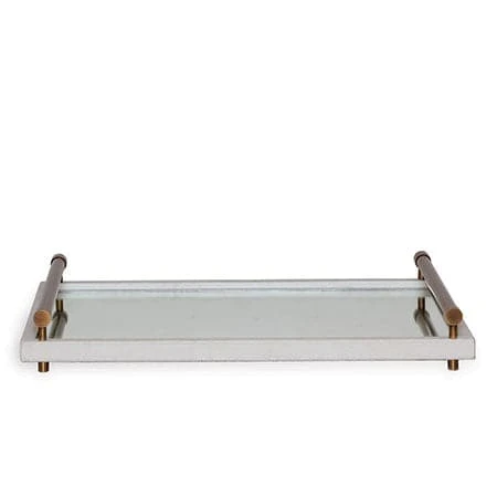 Cairo is our modern serving tray wrapped in faux shagreen and finished with accents of aged brass. The frame is made from steel, then wrapped in the shagreen. Reflective top is mirror. Handles and bottom four metal feet are finished in aged brass. Classic and modern–perfect for a display of objets, or as a small bar surface for your favorite beverages.