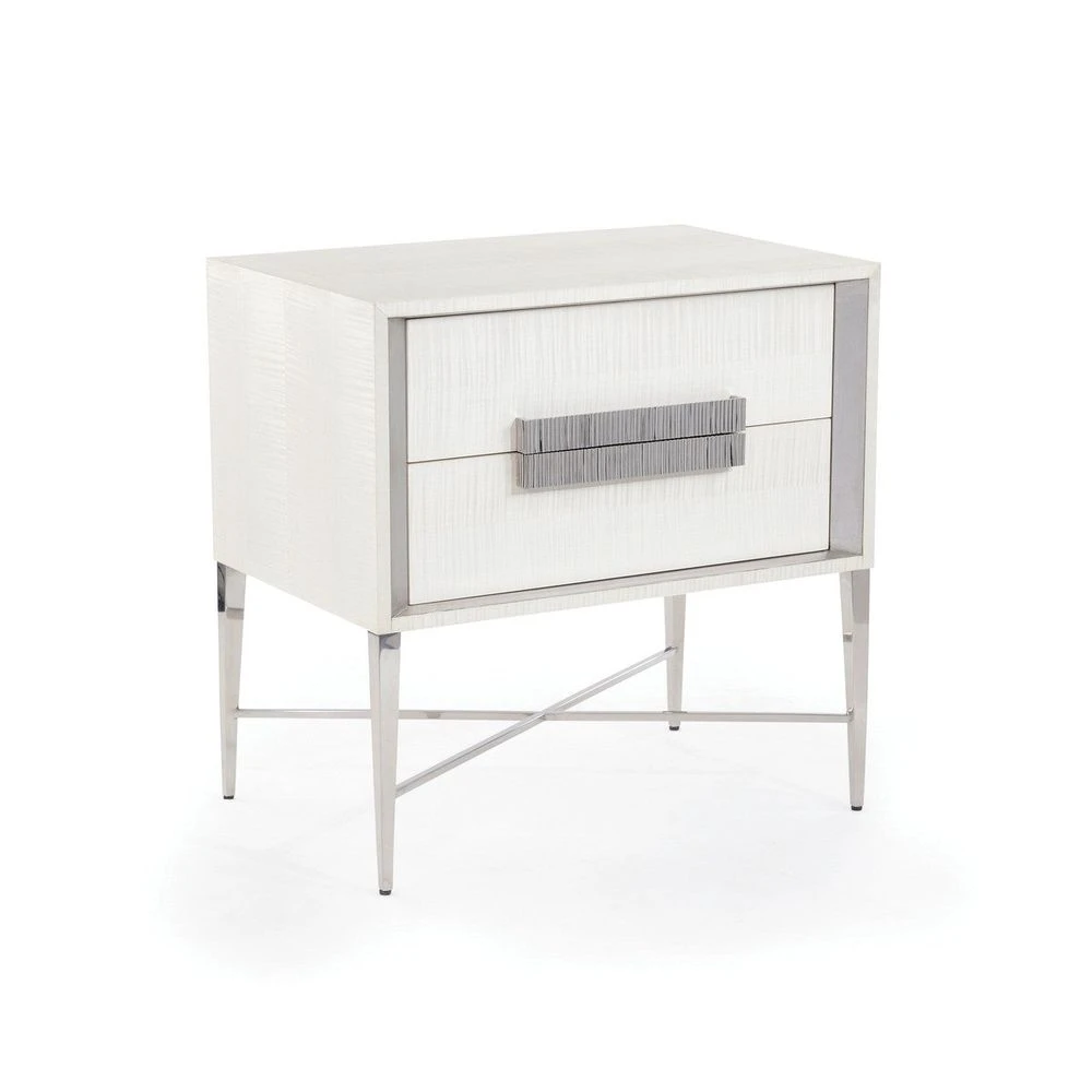 Description: This contemporary nightstand features two drawers and a brushed stainless steel base. The case has a dyed fiddleback sycamore veneer in arctic white with chamfered insets in pewter silver. Each drawer features a cast stainless steel handle with a textured design.