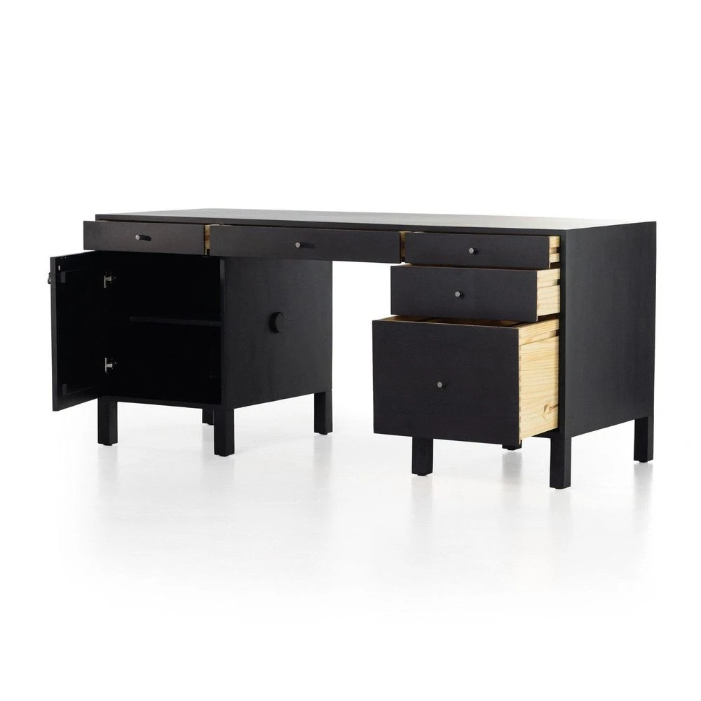 - Description: Beautifully simple in spirit. Black-washed solid poplar forms a clean, Seventies-inspired executive desk with dovetail joinery plus iron and leather hardware, for a material-driven update to Shaker-like styling. Fully finished back grants the option to float desk anywhere in room.