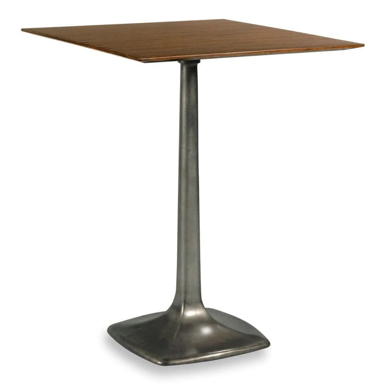 A round or square top rests over a cast metal tapering central column and base in a gunmetal finish.