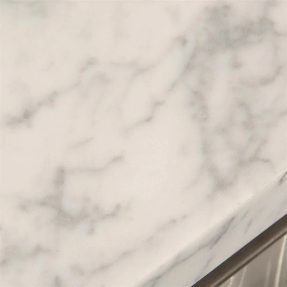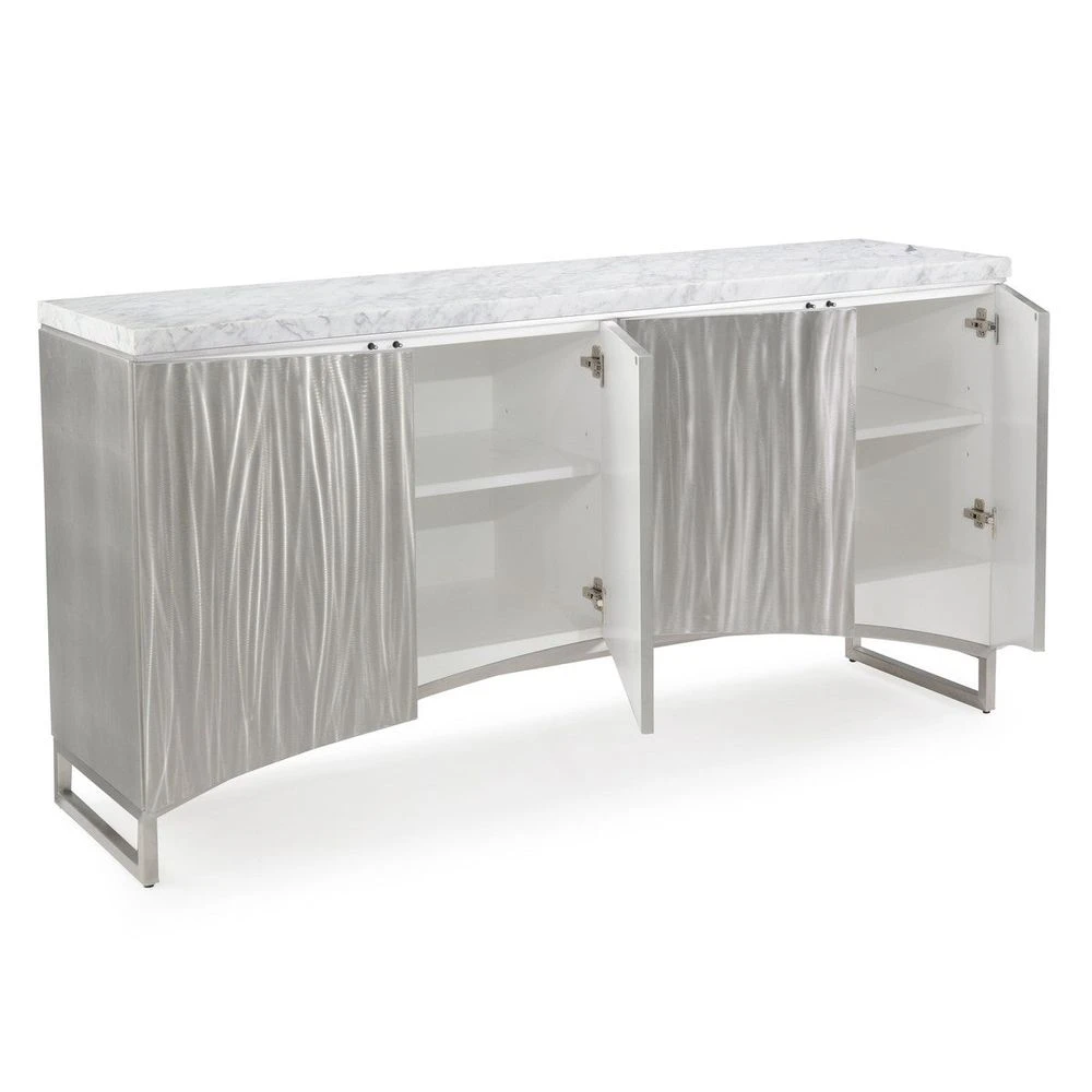 Description: The Camden Sideboard has four doors featuring Brushed Stainless Steel door fronts, a case in Pewter Silver, and a white marble top. The case is set on a Brushed Stainless Steel base.