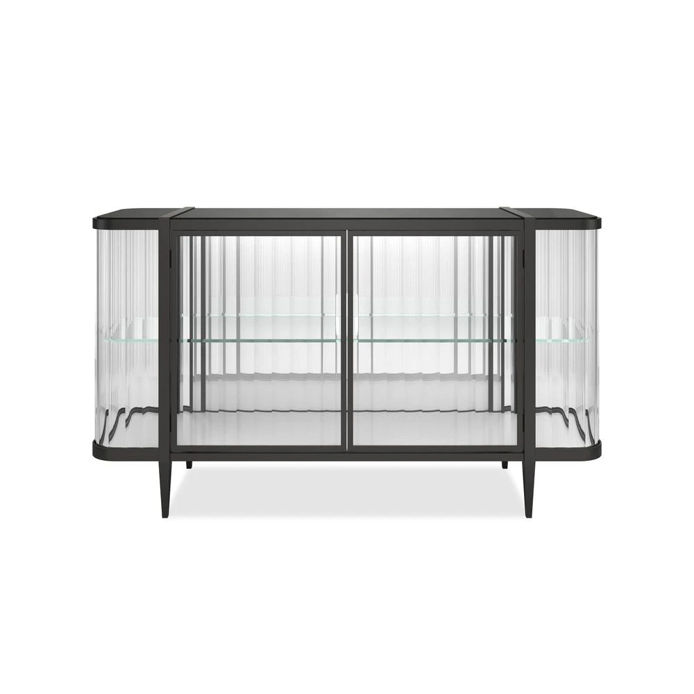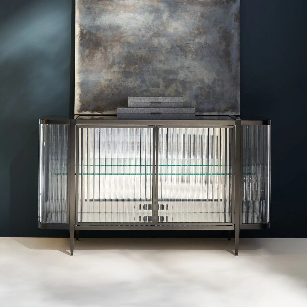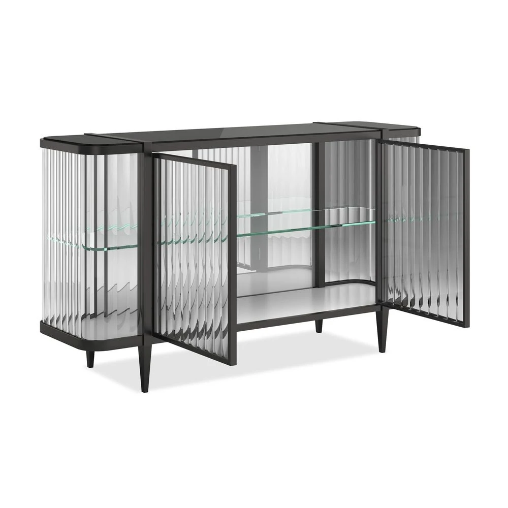 It’s true, this console is so extraordinary, you can’t help but Stop And Stare. It’s an instant source of brightness and reflectivity that creates a natural focal point. A wavy acrylic exterior mirrors the undulating patterns of sand and sea while its top adds another layer of organic splendor. The mirrored interior back and bottom panels are designed to reflect light as it pours in from every angle as well as mirror the beauty of the treasures you display. Glass shelves ensure unobstructed views as do its touch-latch doors with concealed hinges. A Brushed Deep Bronze outlines its rounded silhouette and four tapered feet, imparting the overall luxe feeling of a diamond in a platinum setting.
