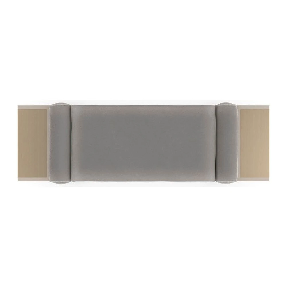 Modern yet elegant in a luxe material mix, this streamlined bench is well-scaled for end-of-bed or an entryway. A reeded apron in a creamy Almond Milk finish brings a sense of rhythm and striking pattern, complemented by a soft gray mohair fabric with a hint of green. Its sleek design featured recessed bolster pillows and opposing metal wings, perfect for placing a book or decorative object. Brushed Gold wraps the ends for a chic finishing touch.