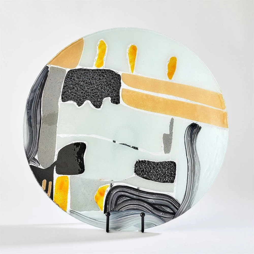 Description: The Cashmere Glass Collection is a testament to the intricate artistry of Portuguese artisans. The process begins with a flat piece of clear glass, which is carefully cut into the shape it will become. The number of colors in the collection determines the number of templates used to layer the sand onto the glass. Artisans start by placing the first template onto the glass and sifting sand through it to fill the template with a specific color. With precision, the template is then lifted and removed. Another template is placed onto the clear glass to sift a different color of sand, creating the next shape. This process is repeated until the flat glass is nearly covered with different colors of sand. Next, artisans lay a clean piece of clear glass on top, creating a sandwich, and carefully transport it to the kiln where it rests upon the shape it will become. In the kiln, it undergoes baking at an incredibly high temperature, fusing the two layers of glass together to create exquisite abstract designs. Plate stands are sold separately from chargers.