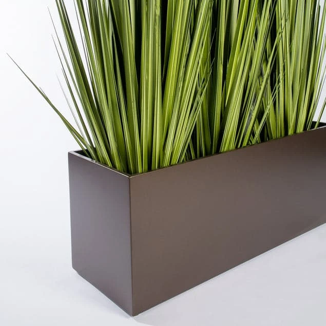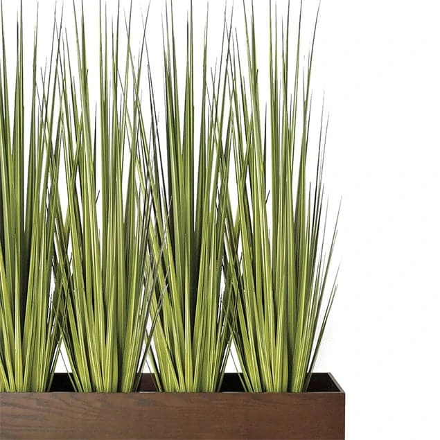 This design has been value engineered to decrease costs and reduce lead time. We have a variety of pre-potted botanicals that will also work with this concept. Exposed round black planter pots are attached inside our custom planter. Custom planter is shown in dark walnut stained oak. Dimensions, colors and textures can be changed. Also, combine with our stock planter legs. Contact us for a quotation of your custom design. Indoor only.