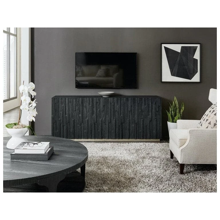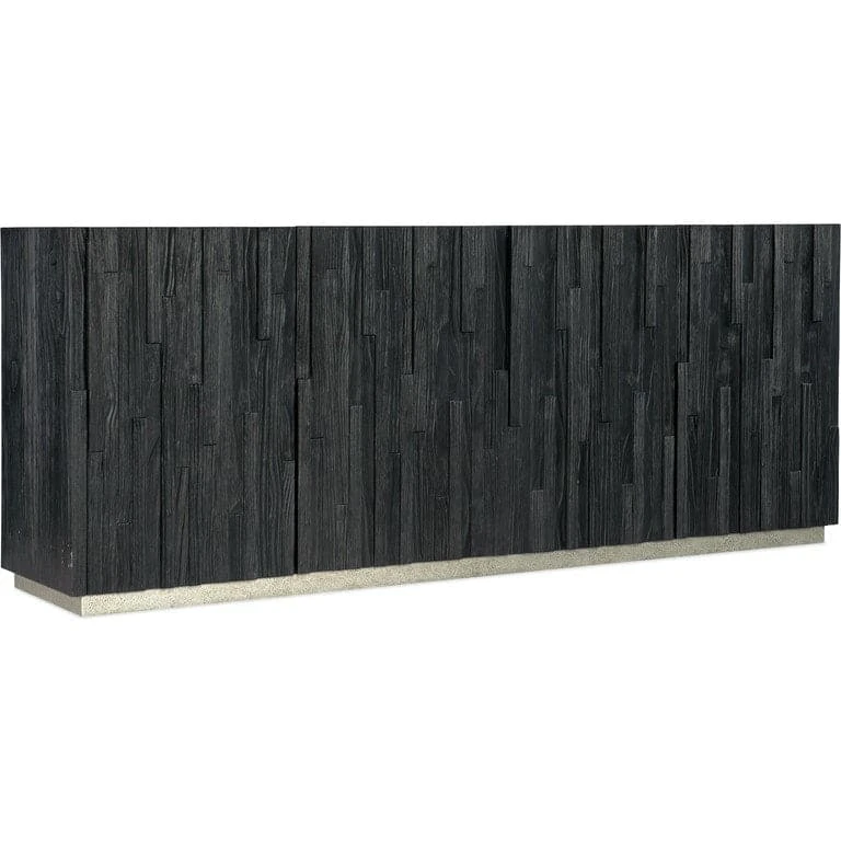 Pine Veneers in a Charred Black finish featuring a Japanese technique to achieve the look of burnt wood create a truly unique piece in the Chapman Entertainment Console. Modern yet warm, and up-to-date while employing an ancient technique, this entertainment center is focal-point worthy while offering 4 doors with soft-close hinges and touch latches, 2 adjustable wood shelves behind each pair of doors, a ventilated back panel and a FC705 3-plug outlet. Accommodates up to an 80-inch TV. Hooker Furniture has launched the Chapman collection, a smaller-scaled, casual-contemporary whole home group. The 55-piece collection features a curated mix of materials that present an updated look inspired by downtown urban living. Over the past several years, Hooker Furniture has embarked on a transformation of our product line, adding more modern and updated styles to our portfolio to reach a younger demographic. Chapman aligns perfectly with this strategy, filling a style gap in our portfolio with a collection that offers contemporary styling with a relaxed, casual feel. Designed for consumers who may live in loft-style spaces or homes with open concept floorplans, pieces are smaller in scale, yet are thoughtfully designed to provide plenty of storage and exude a sophisticated style.