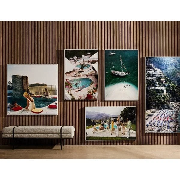A specially selected work from the late influential photographer Slim Aarons is printed using ultra-modern ChromaLuxe technology for the first time ever. High in definition and gloss, images are printed in vibrant, saturated color on fade- and scratch-resistant recycled aluminum. Each is float-mounted with hand-selected framing designed to complement the print. Handmade in Austin, Texas, each piece includes a certificate of authenticity commemorating the exclusive partnership between Slim Aarons, Getty Images Gallery and Four Hands Art Studio. Photo courtesy of Getty Images.